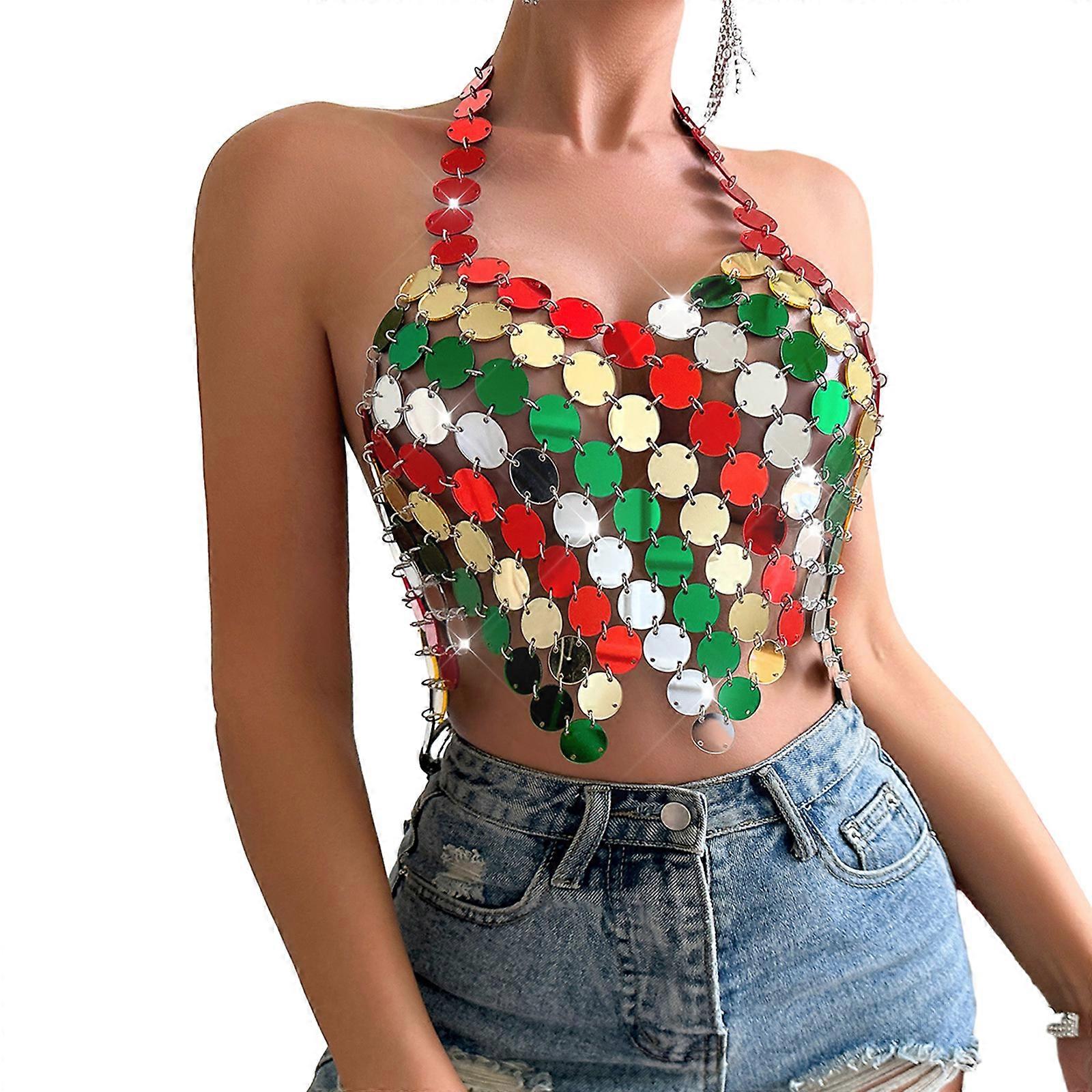 Sparkly Colorful Acrylic Sequins Backless Bikini Crop Top for Women Party Nightclub Body Chain Jewelry Festival Outfit S
