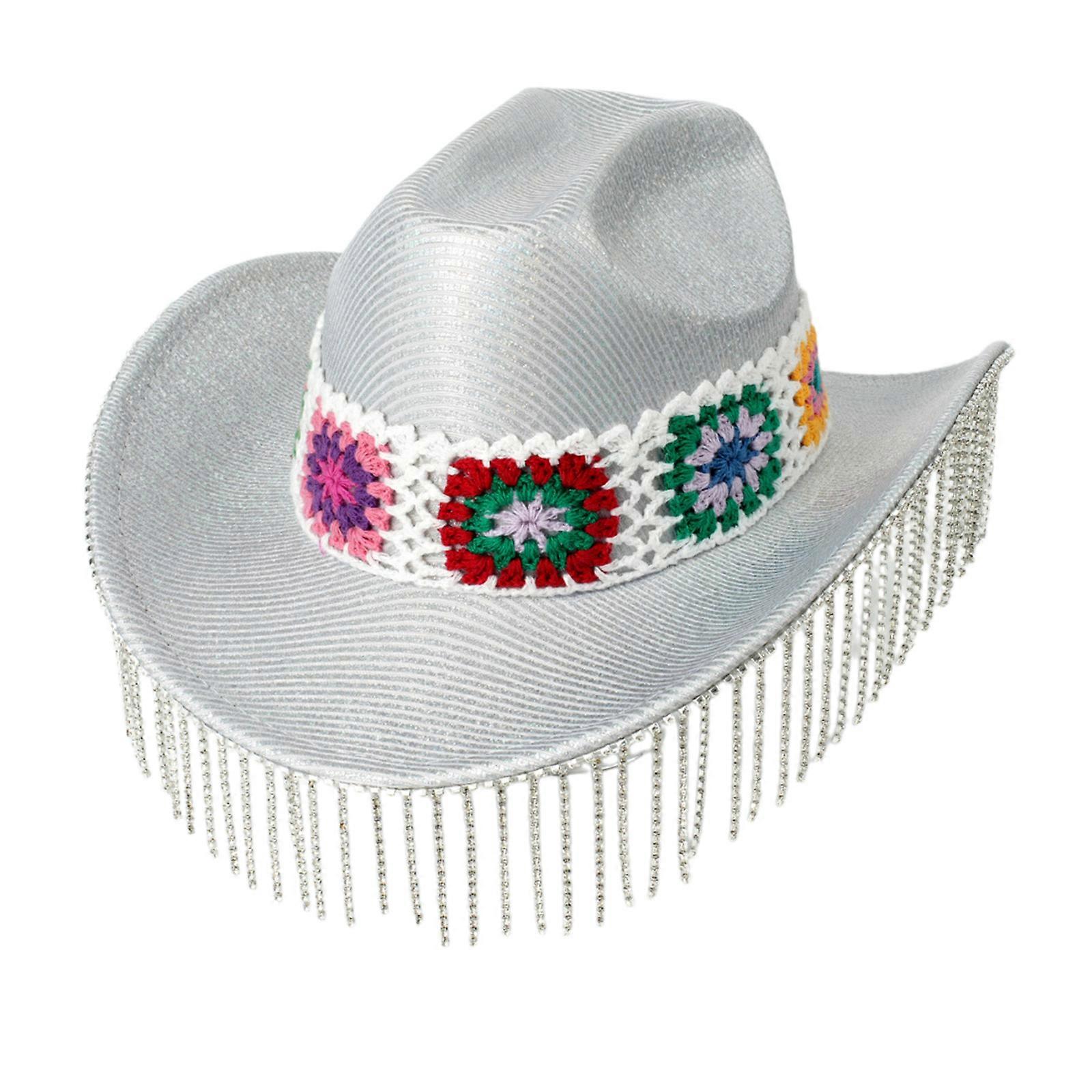 Sparkly Rhinestones Tassels Cowboy Hats Crocheted Belt for Bachelorette Party Crystal Hat for Club Stage Bar Silver