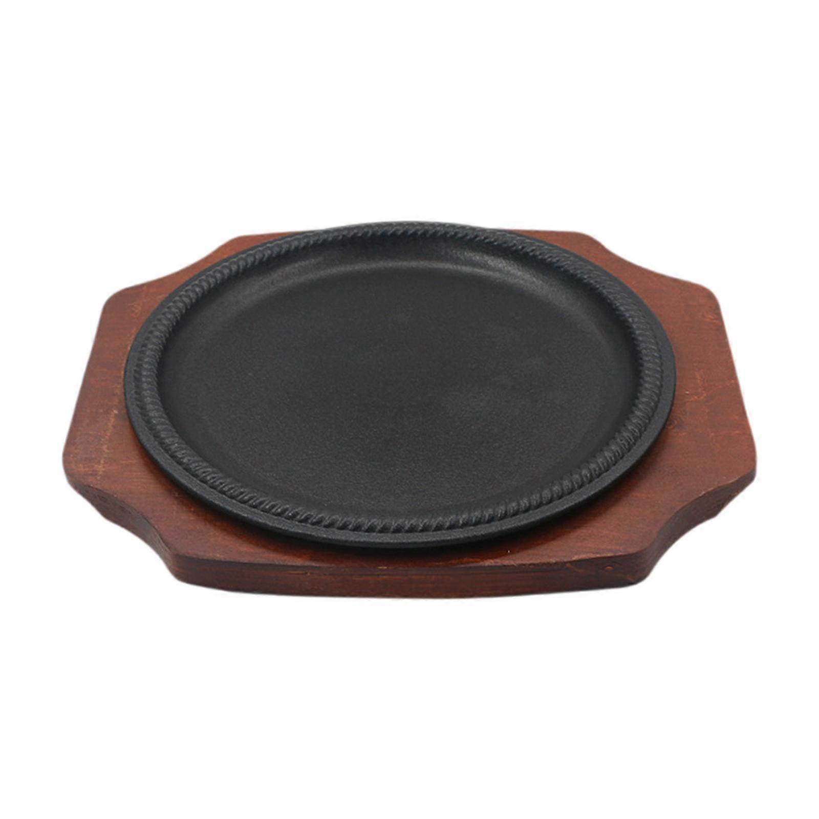 Griddle Steak Plate Tray Nonstick with Wooden Base Platter Sizzling Steak Plate
