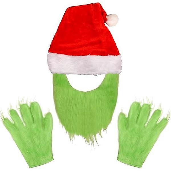 Grinch Beard Santa Hat with Green Furry Mittens Grinch Mask Glove Christmas Party Cosplay Costume Accessories