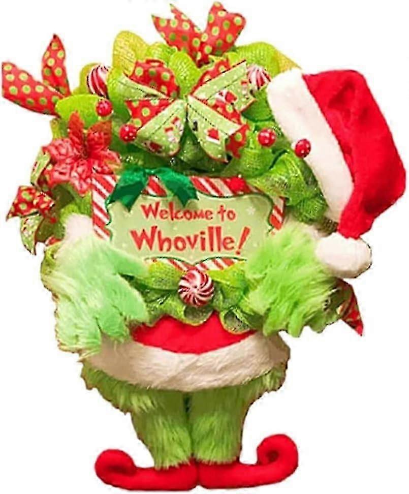 Grinch Christmas Plush Wreath for Front Door, Elf Body Burlap Plush Legs Decorations Bow Wreath