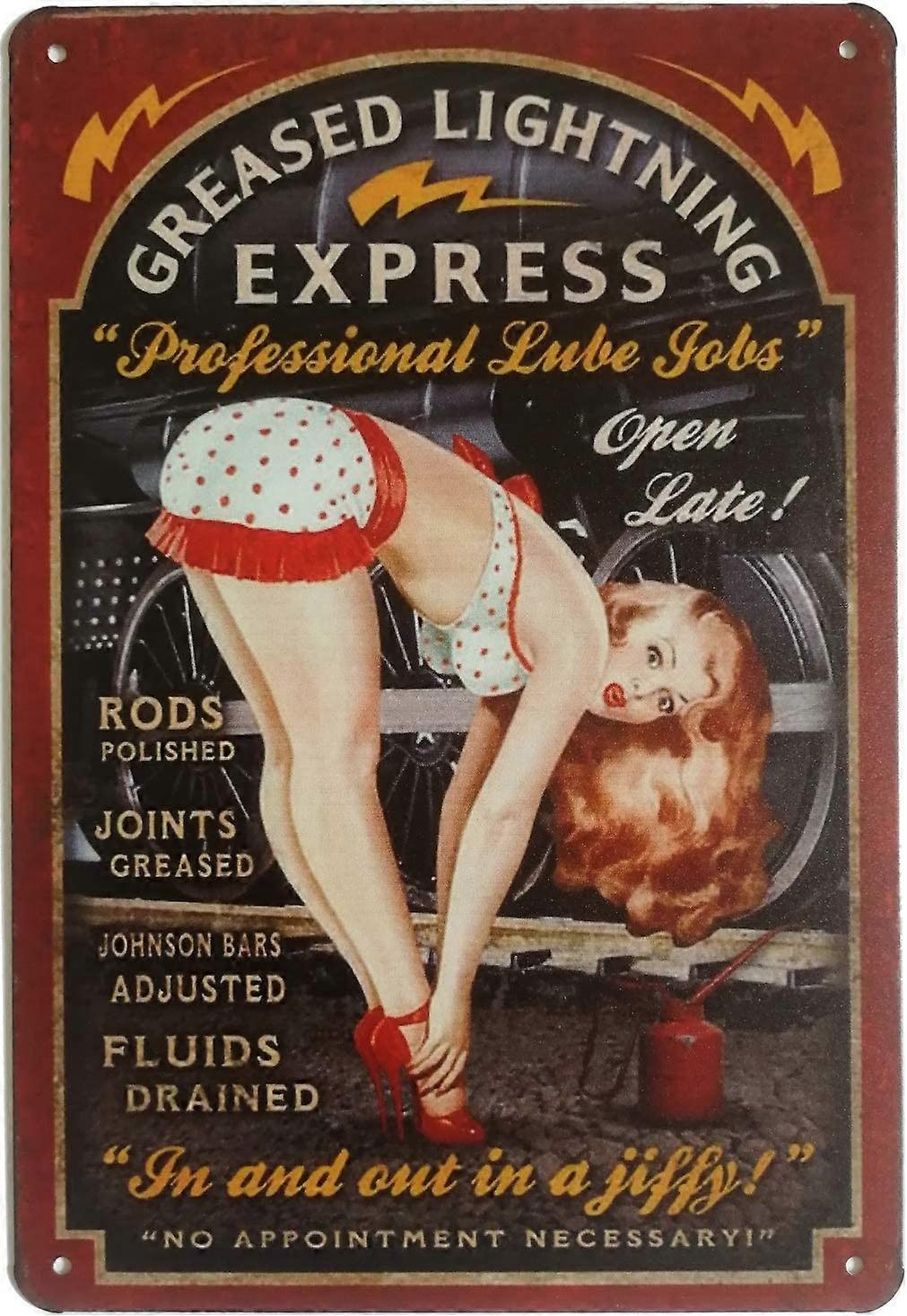 Greased Lightning Pin Up Girl Garage or Man Cave Sign Retro Vintage Decor Metal Tin Sign 12 X 8 Inches