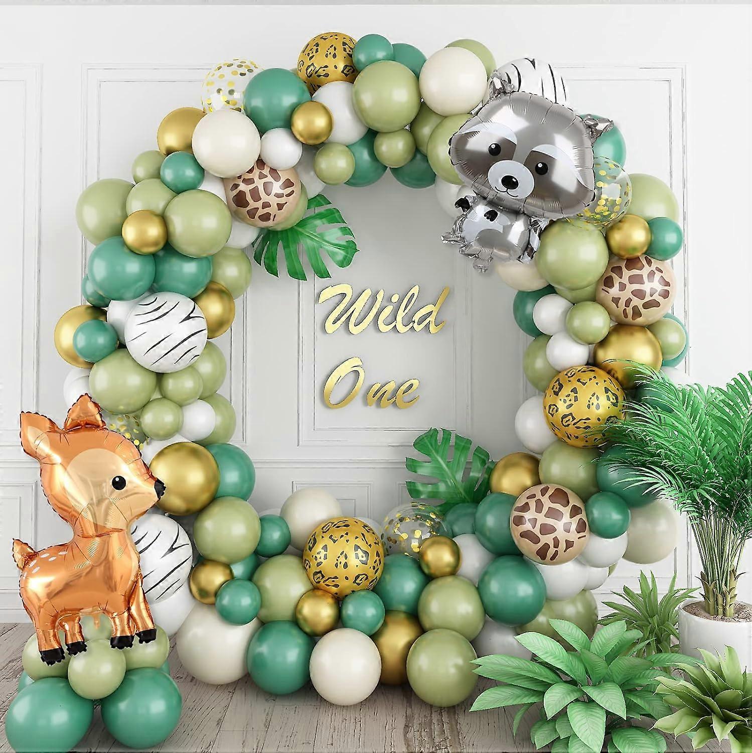 Green Balloon Arch Kit, Jungle Safari Balloon Arch, Jungle Theme Party Balloons with Sage Green White Latex Balloons Metallic Gold Animal Decorations