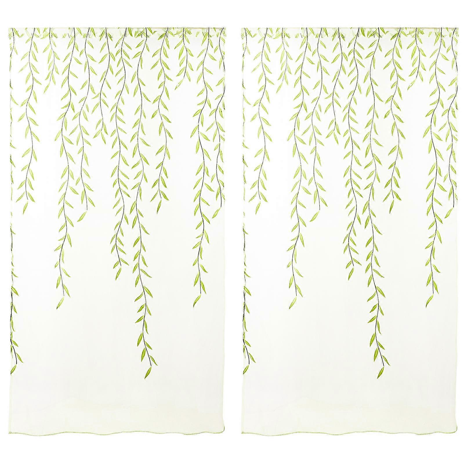 White Sheer Voile Curtains with Green Embroidery Pattern, Rod Pocket Design for Bedroom, Living Room and Balcony Decoration