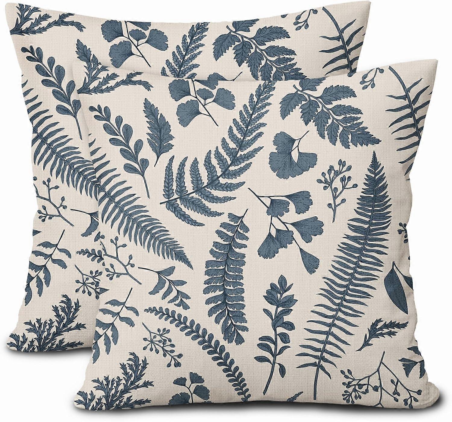 Gray Blue Leaf Plant Pillow Covers 18X18 Inch Set of 2 Grey Tropical Fern Herbs Botanical Leaves Floral Decorative Pillow Cases Vintage Cushion Case F