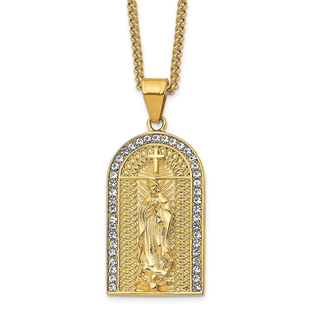 21.5mm Stainless Steel Polished Yellow Ip Plated With Crystal Blessed Mary Pendant a Curb Chain Necklace 24 Inch Chain-N