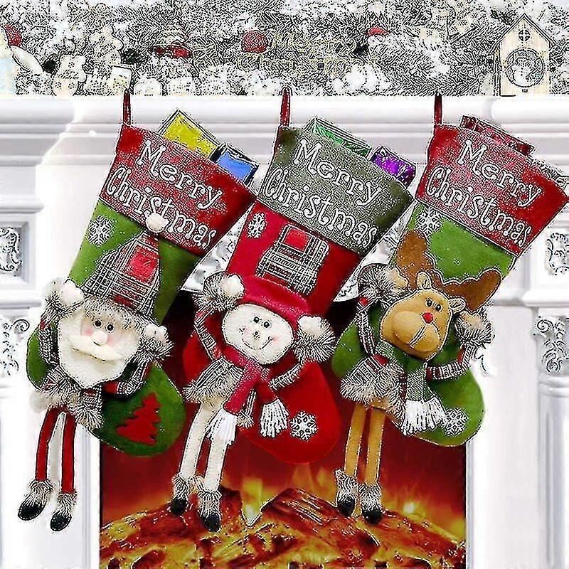 3-piece Christmas stocking: Santa Claus, snowman and reindeer with dangling legs. These are the cutest Christmas socks this season. Between Santa Claus and his friends, there is a figure that everyone in your family will love.- -Good quality: made of flannel and non-woven fabric. Durable and washable, reusable and easily folds flat to save space when not in use.- -Dimensions: 60cm from top to bottom. The opening measures 25 cm. Large Christmas fireplace stockings can be filled with Christmas essentials such as candy, gift toys, etc.- -Each one comes with fabric hanging loops, so you can easily and safely hang them on trees, fireplaces, walls, etc. All details are included carefully designed and are perfect for filling a variety of gifts.- -Beautiful look: traditional and classic Christmas elements, beautiful party gift for a matching Christmas tree and a wonderful way to give gifts this holiday season, fun for the whole Family.