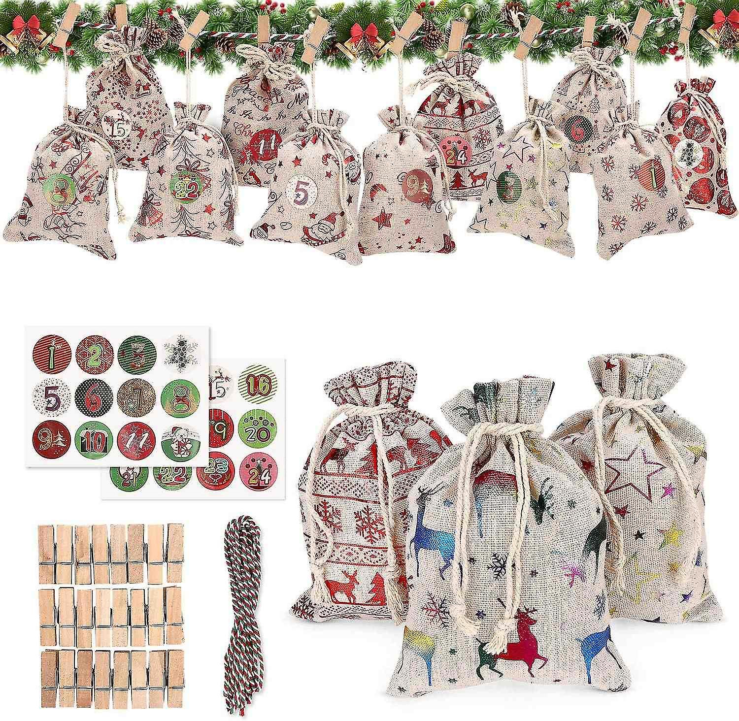 Cotton Sheets Advent Calendar Our 24 cotton sheets advent calendars include 12 different patterns, with 24 number stickers, which can be easily disassembled and pasted on the bag. Kids can easily count to Christmas by giving candies or gifts every day put in their pockets and add a cozy, homey atmosphere to your Christmas holidays^ PREMIUM MATERIALThe Christmas advent calendar is made of high quality canvas with sturdy red, green and white lines to seal the gift bags securely. Each bag measures 10*14cm. Finely built. Quality craftsmanship ensures this calendar can be used year after year. It is the best choice for your Christmas countdown^ HOLIDAY DESIGNSophisticated and unique design. This cute Christmas advent calendar features a variety of classic Christmas elements such as five-pointed stars, hanging baubles, moose, snowflakes, bells, Christmas stockings, Christmas trees and Santa Claus. Red and colored patterns add to the festive spirit and are perfect for Christmas decorations^ IDEAL FORChristmas Countdown Advent Calendar is a perfect addition to your Christmas decorations. You can choose to put a Christmas present, toy or treat in each bag. It will bring the fun you can have with little gifts opened daily until the 24th. Ideal for hanging on the wall, Christmas tree, door, wall or mantel, very eye-catching