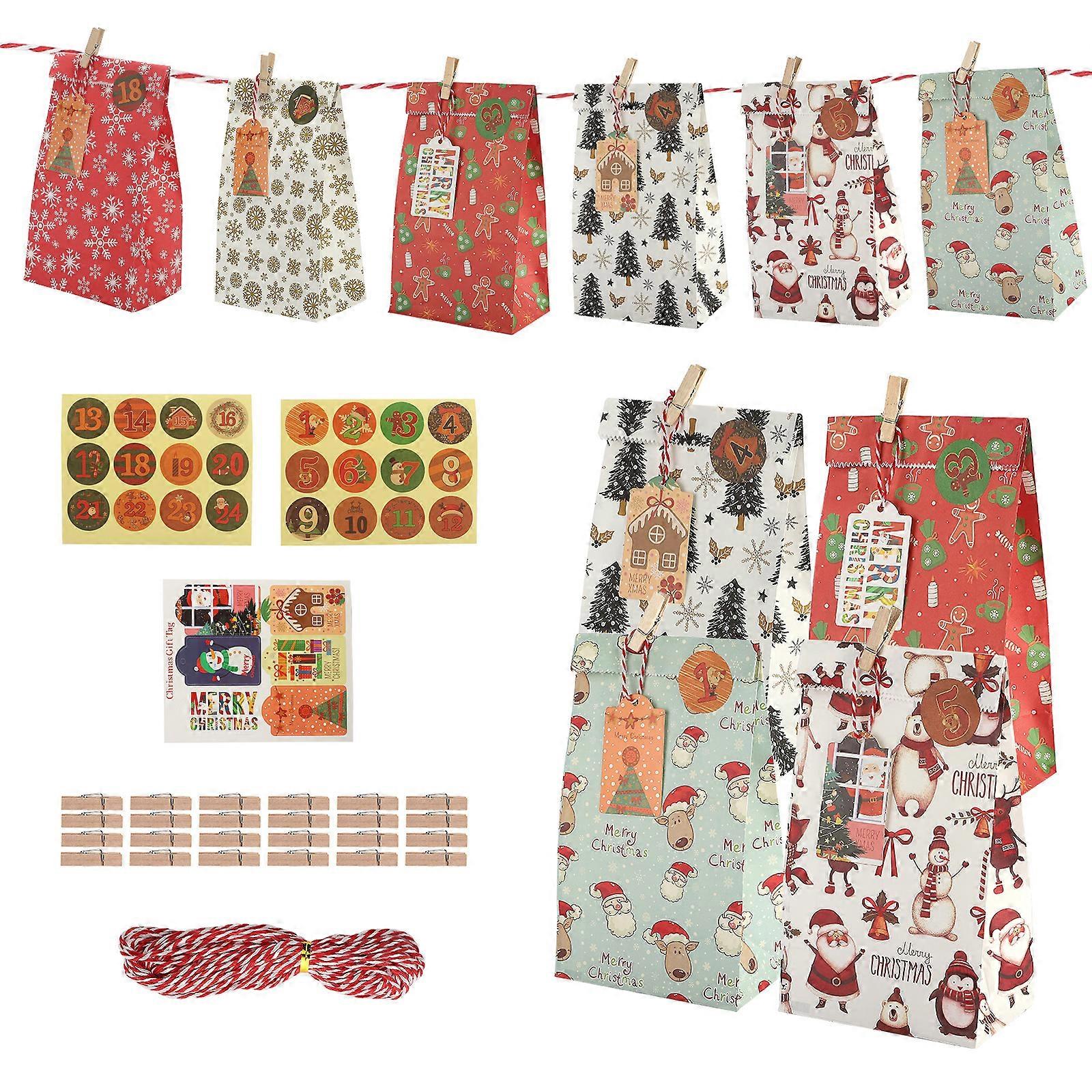 Christmas Gift Bag Candy Bag Set (Style 8-24pcs Christmas Paper Bag+24pcs Christmas Sticker+24pcs Clip+10m Rope+24-30pcs Hanging Tag)