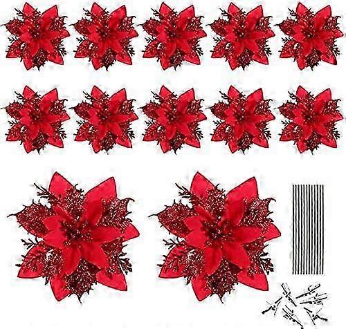 Christmas Glitter Artificial Poinsettia Flower Pattern 12Pcs Christmas Tree Flower Pattern Ornaments Xmas Party Decoration with 12Pcs Stems and Clips
