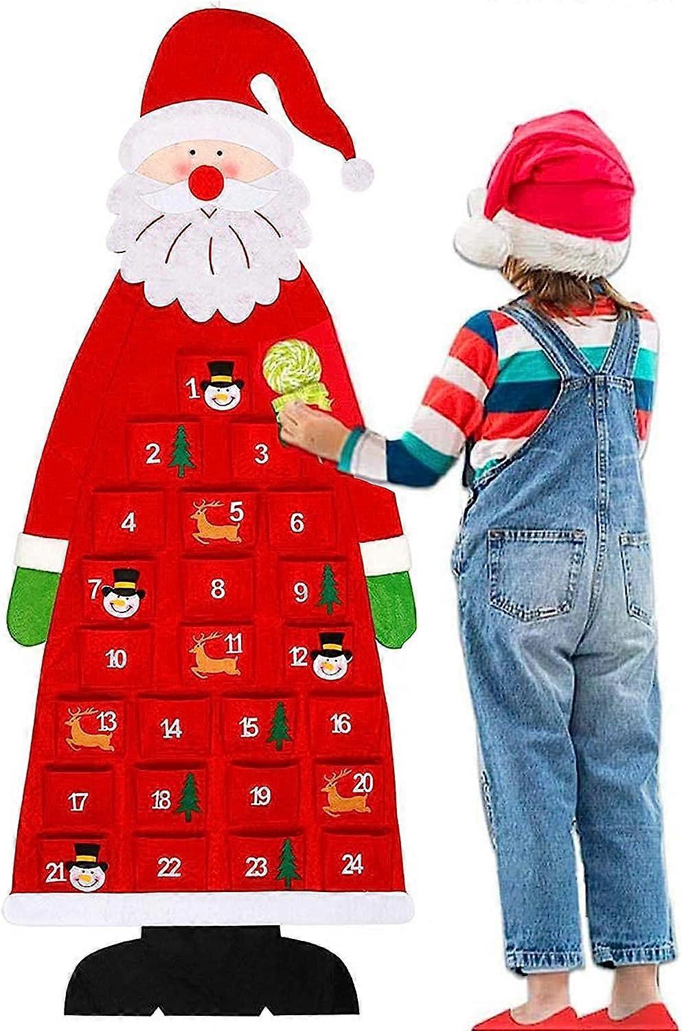 [Christmas Advent Calendar] The exquisite Santa Claus shape comes with 24 individually numbered pockets. We will accompany you and the children on a happy Christmas countdown, and count down together and look forward to the coming of Christmas until Christmas Eve on December 24. [Exquisite Christmas Decorations] Christmas Advent Calendar is the perfect Christmas decoration for home, office, Christmas tree, door, or fireplace, allowing you and your family to spend a warm and interesting Christmas holiday. A smiling happy Santa Claus calendar will bring you a good mood! [Ideal gift for children] This cute countdown calendar is an excellent gift for children, who are looking forward to Christmas every day and bring them a lot of holiday fun. Your child will be very excited to get such a cute and well-made Christmas Advent calendar, and children aged 1-12 will love this calendar very much. [Small items storage] There are 24 pockets to store items. There is enough pocket space for candy, riddles, cosmetics, chocolates, gift cards, small toys, wine bottles, and anything interesting. A strong rope can carry many small Christmas decorations. Santa Claus will not bend or move under the weight of candy, so it is strong and durable. [Add Christmas atmosphere] This desk calendar is the perfect way to bring Christmas joy to your home this holiday season. This timeless decoration is sure to make your home decoration "amazing" and bring the Christmas spirit into your home, suitable for various decoration styles and themes, and you can display these decorations year after year. Specification: color: red -material: high quality felt -size: 115cmX45cm (45.28inX17.72in) -small pocket size: 2.8cmX2.7cm (1.11inX1.06in), a total of 24 pockets -machine washing and rinsing are not recommended