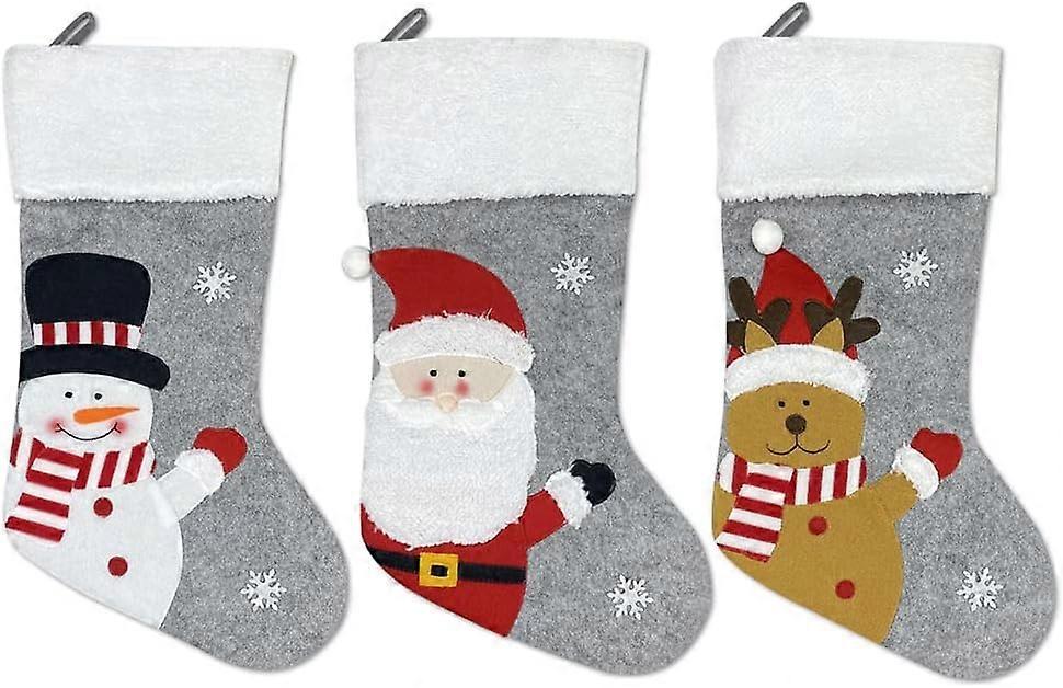 3.3D Applique Design: These Christmas stockings set of 3 is based on classic pattern with 3D Applique of lovely Christmas characters snowman, reindeer and Santa Claus. very cute and overall these Xmas stockings feels festive. It's perfectly Holiday decorations.