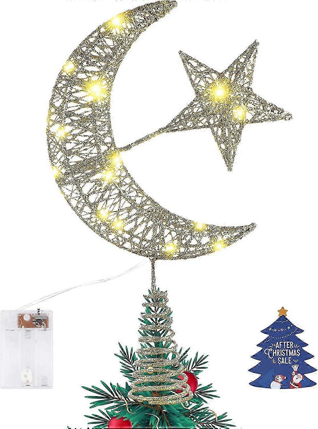 Warm Color String Lights3 Aa Batteries (Not Included) Are Enough To Light Up This Tree Decoration, You Can Choose From Three States: "On", "Flashing" And "Off". The Extension Cord Can Hide The Battery Device On The Christmas Tree, You Don'T Need To Install Extra Wires.Unique Design30Cm(H)*20Cm(B), 5Cm And Suitable For Most Christmas Trees. Suitable For Both Indoor Party Decoration, Match Most Christmas-Themed Decoration. It'S Easy To Store, Ready For The Festivities For Years To Come.Beautiful Christmas Tree DecorationThe Tip Of The Christmas Tree Decoration Is A Classic Christmas Tree Decoration. 'Yellow And Warm Light Are Full Of Happiness And Warmth,Suitable For Any Style Of Christmas Tree,Adding A Finishing Touch To Your Christmas Home Decoration.Coupled With Exquisite Packaging,Also A Great Gift Choice Christmas De Nice.Must-Have Christmas AccessoryGolden Tree Stars Moon Appearance Is Suitable For Real And Artificial Trees. It Can Be Widely Used In Homes, Shops, Offices, Hotels, Restaurants And Bars. Bring Good Atmosphere For Christmas, Accompany You Spend An Unforgettable And Festival.Fine WorkmanshipThe Tree Star Sparkling Christmas Tree Made Of High Quality Metal Wire,The Base Adopts Hollow Design, Which Can Be Firmly Placed On The Christmas Tree Or Placed At Home As A Decoration.The Unique Hollow Design With Golden Glitter Powder,This Decoration Christmas Tree Ornament Is Will Make Your Christmas Party Look More Lovely, Vivid And Charming.