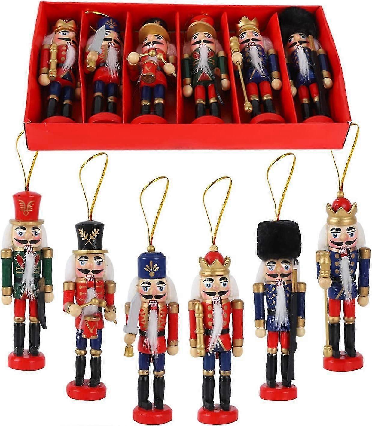 Christmas Nutcracker OrnamentsYou will receive 6 pieces Hanging King Figurines Puppet Nutcracker :The nutcracker ornament comes with a variety of classic and popular Christmas elements.Traditional nutcracker is the perfect accent for your home decor during the holiday season. Wooden Nutcracker Soldier SizeOur wooden Christmas nutcracker size is 5.1*1.06 inches/13*2.7 cm.Wooden Christmas nutcracker soldier are full of Christmas joy and happiness.They can make your house more festive and allow your friends to enjoy the festive atmosphere easily to enjoy. High Quantity MaterialOur nutcracker ornament is made of wooden materials, hand-painted in color, come with retro design.The thick white beard is made of fiber fur, which is very smooth and comfortable.Its cute appearance is very popular with children. Christmas Classic Theme ElementsIn legend, the nutcracker can bring energy and good luck patron saint, they bare teeth in the face of evil, protects people from misfortune, and brings good luck , happiness and warmth to people.The round base can stand firmly on the table as a home table decoration. Widely ApplicationYou can attach the wooden nutcracker soldier to your Christmas tree with a rope on his hat hang, and also stand firmly on the table, fireplace, bookshelf with its round base. Wooden Christmas nutcracker set in different dresses and colors. Well hand-painted, finely detailed and very stable.