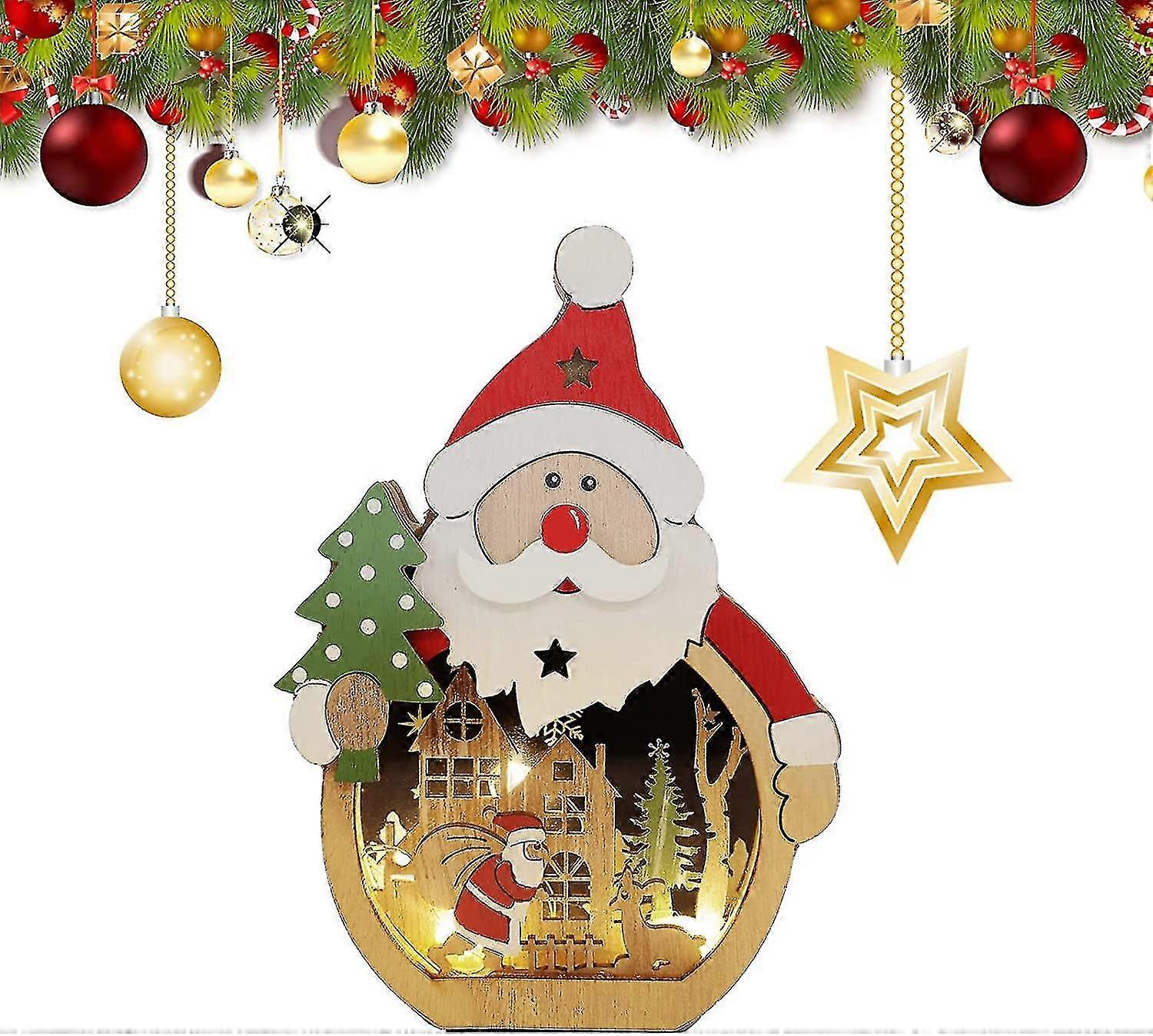 Santa Claus Ornaments with Lights: This perfect wooden Christmas ornament shape is the image of santa claus that children extremely love, there is also a mini santa claus, Christmas tree, elk, snowflakes, and house carved from wood, forming a harmonious scene. In addition, turn on the switch of the LED light, the LED light buried inside illuminates the whole scene, very warm (requires two AAA batteries, not included).