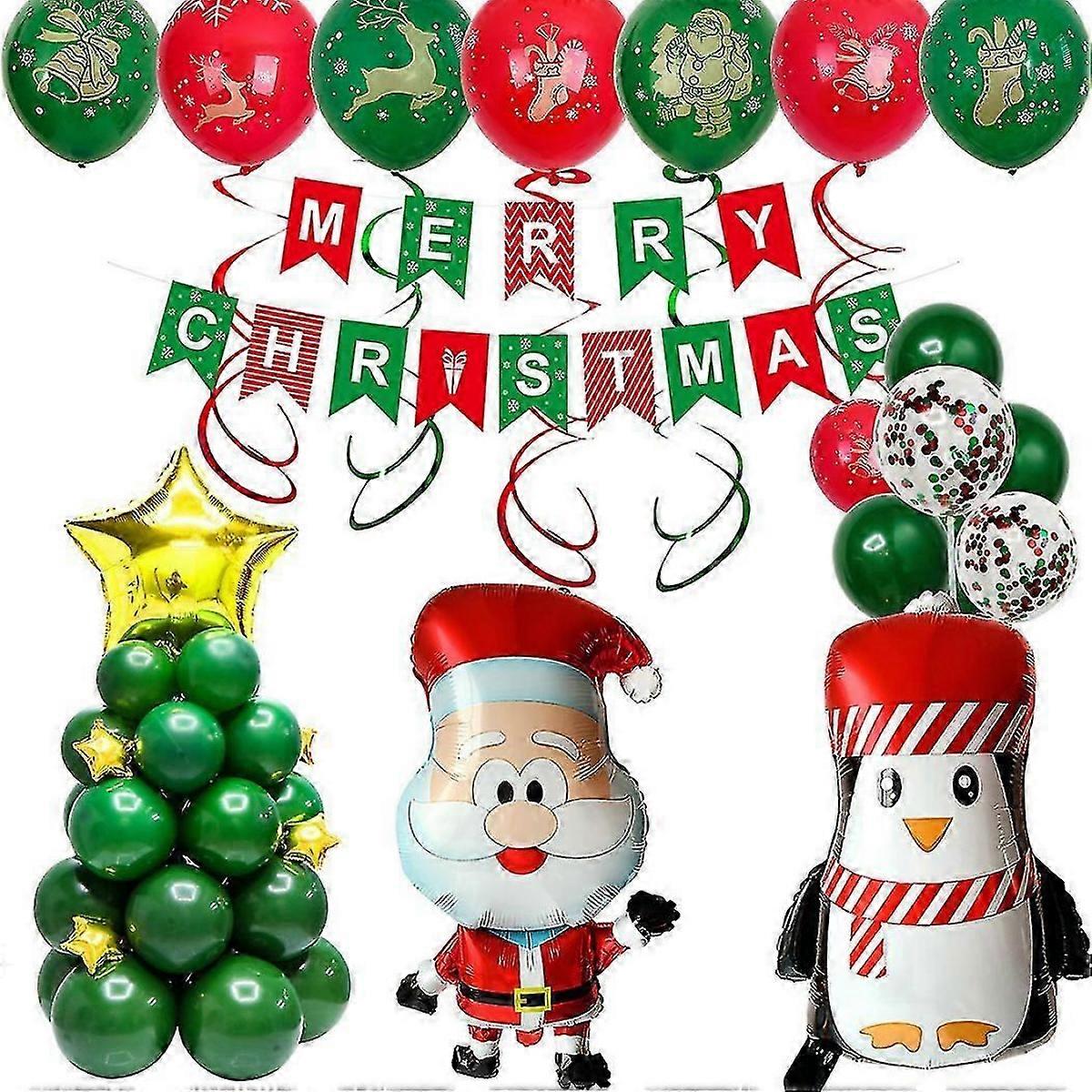 Perfect Christmas Decoration: Immerse yourself in the goodness of Christmas by decorating this Christmas party decoration in your living room, bedroom, kitchen, classroom, office. It will make your Christmas party special and memorable, suitable for kids, teens and adults alike<br> You can use them to make Christmas party backdrops or photo booth backdrops.<br> Product Features Everything in the set is a must-have for Christmas decoration, high quality and full of Christmas elements. Paper products are easy to assemble.<br> Multiple sets in one: You never have to worry about getting ready for your upcoming Christmas party. Our Christmas party supplies include all the party products you need. Plus, we've included the tools you need, which are convenient and easy to operate, and you'll be amazed by the ambience after installation. Including Penguin*1, Santa Claus*Pull Flag*1, 12-inch gilded red balloon*4, 12-inch gilded green balloon*4, 12-inch sequined balloon*2, 18-inch pentagram*1,5-inch 5-pointed star, 12 Inch dark green balloon *30, spiral 1 pack<br> Product color: colorful<br> Product size: linen size: 13*17cm, flag rope length 130cm<br> Shipping quantity: 1 set