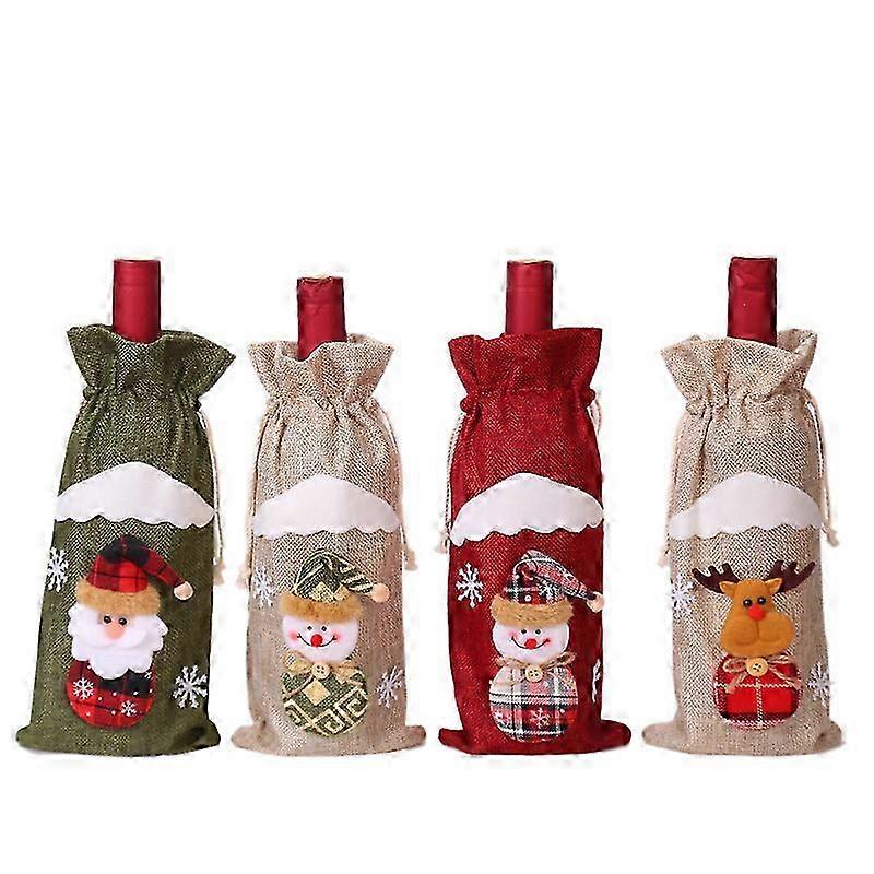 Christmas Linen Old Man Doll with Red Wine Bottle Set & Wine Bag for Holiday Hotel Decorations (4pcs)