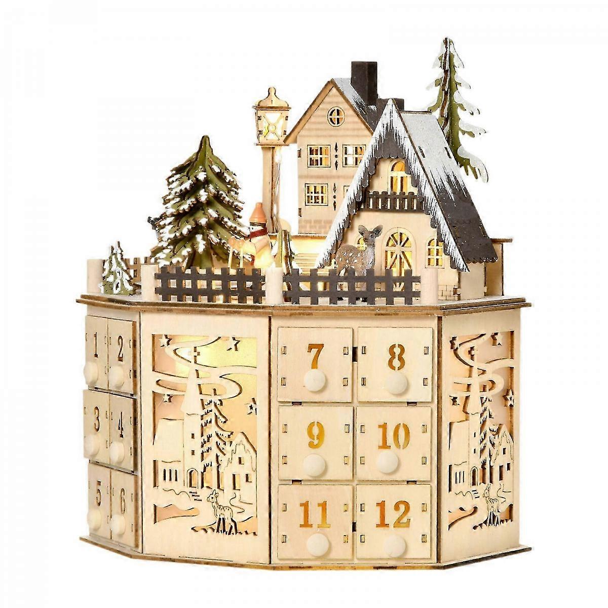 【Christmas Theme】: This LED Advent Calendar is the way to bring Cheer to your home this holiday season, and add  to your decorations 【Material】:Christmas wooden advent calendar house made of wooden material,which is sturdy for long term use 【Design】: 24 drawers traditional wood advent calendar which is creative design 【Christmas Decor】:Light up table xmas wooden holiday decoration is ideal holiday, party, table decor 【Gift】: Led holiday decoration is ideal gift for family friends on Christmas day Specification: 3 AAA batteries(Not included) Size Chart: 25cmx18.5cmx30cm/9.84inchx7.28inchx11.81inch Package Includes: 1  Christmas Wooden Advent Calendar Note: 1. This is not infant toy , please take away from kids to avoid eating. 2. Please allow slightly error due to manual measurement. 3. Due to the difference between different monitors, the picture may not reflect the actual color of the item. Thank you! 4. Wish you a wonderful on-line shopping!