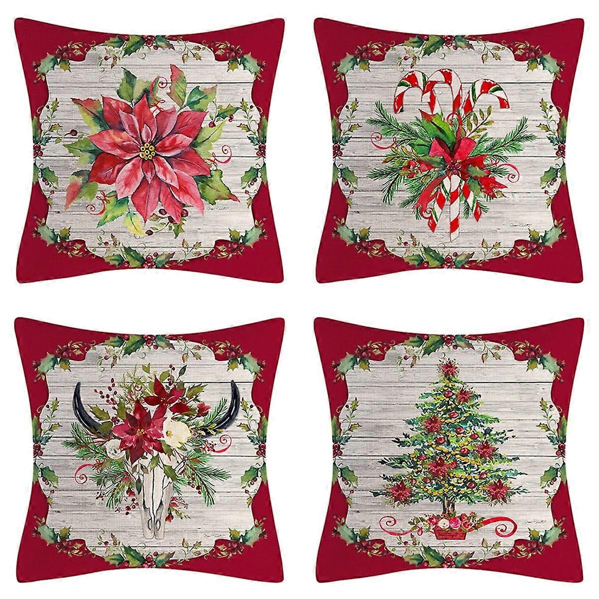 Christmas Pillow Covers 18x18 Christmas Tree Christmas Flower Decoration Throw Pillow Covers Cotton Linen Cushion Case for Home Decor Set of 4