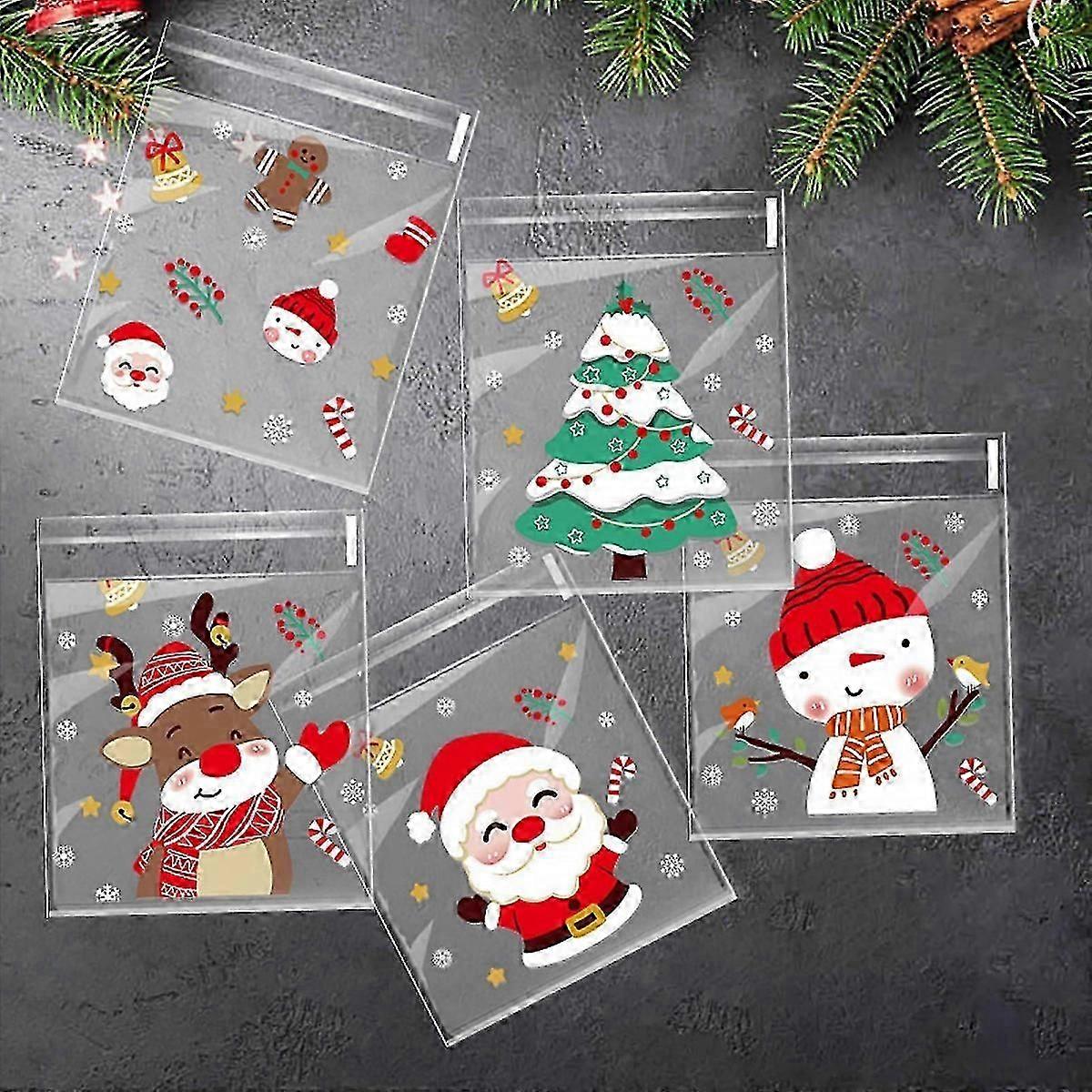 Self-Adhesive Cookie Bags for Christmas, 200 Pack, 10x10 cm, Cellophane, Easy Seal, Santa, Tree, Elk Designs