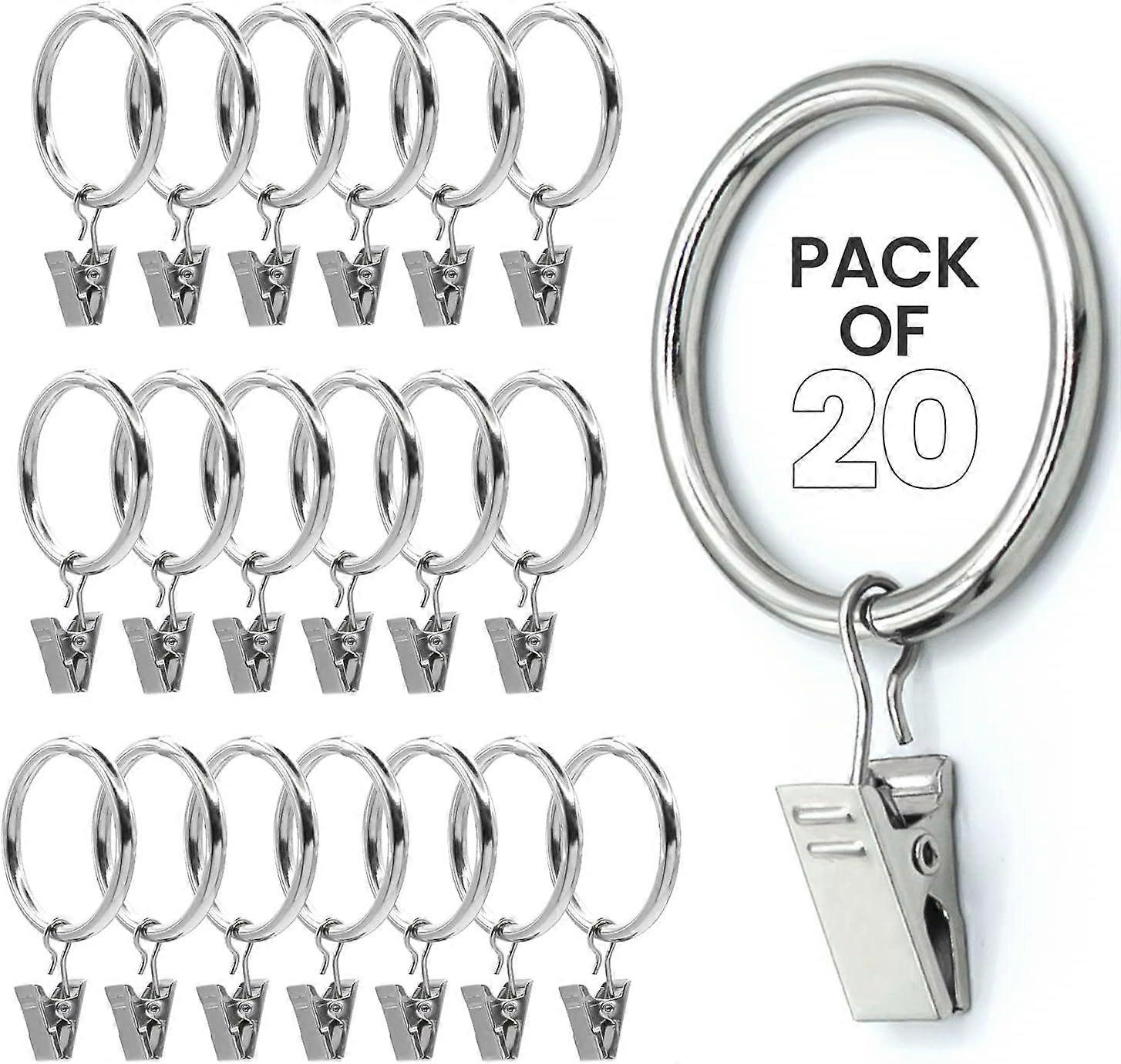 Silver Curtain Rings with Clips 1.5 Inch Set of 20 Heavy Duty Curtain Hooks for