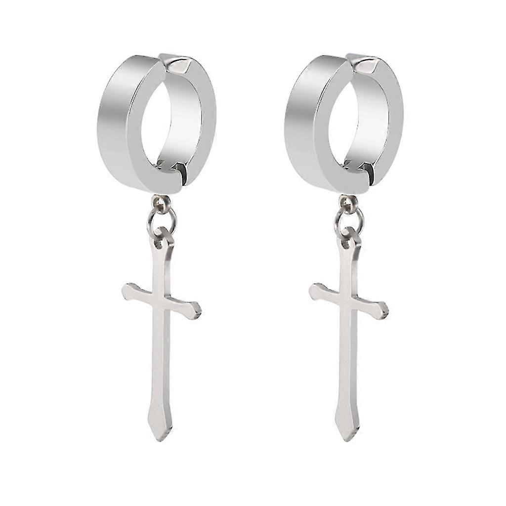 Non-Pierced Clip On Cross Dangle Hoop Earrings Set, Stainless Steel No Piercing