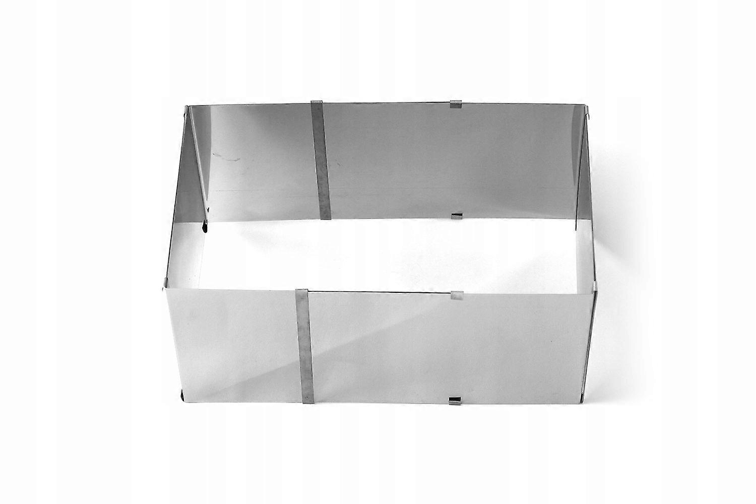 ADJUSTABLE FORMA FOR BAKING - RECTANGULAR with additional scale CONVENIENT FORMA FOR BAKING WITH ADJUSTABLE LENGTH AND WIDTH Forma for cakes and pastries is an excellent alternative to traditional baking sheets. It does not ma bottom, and the dough is poured onto any surface lined with parchment or baking paper. In addition, forma ma pull-out scale. Forma made entirely of stainless steel. Ideal for baking cakes, resistant to high temperature and corrosion, easy to clean and convenient to use. The mold can be used for: baking biscuits and various types of cakes, translating cakes and cakes, folding cakes. The form is guaranteed by a perfectly baked square sponge cake, with perfectly even sides. ADJUSTABLE RIM Forma has the ability to smoothly adjust the length and width. An additional advantage is the division, which provides the opportunity to bake two cakes at the same time. The pitch is movable, so we can set it on any length of the rim or completely disassemble it, in addition, it has a length adjustment. The scale can be completely removed from the rim. Maximum dimensions of the rim. Minimum dimensions of the rim. FEATURES AND ADVANTAGES OF THE PRODUCT Perfect for baking a multi-level cake. Forma ma included an additional, adjustable graduation, so you can bake two different cakes at the same time. Irreplaceable when making such a wonderful dessert as tiramisu. Thanks to the adjustment, it can be used to create a square or rectangle. Easy to use and resistant to high temperatures. Smooth size adjustment - forma adapts to cakes. Rant replaces having multiple sheets in different sizes. SPECIFICATION Sheet metal max. COMPOSED: width 17,5 cm length 25,5 cm height 5 cm Sheet metal max. UNFOLDED: width 32,3 cm length 48 cm height 5 cm material: high quality stal stainless additional graduation in a set with sheet metal color: shades of gray
