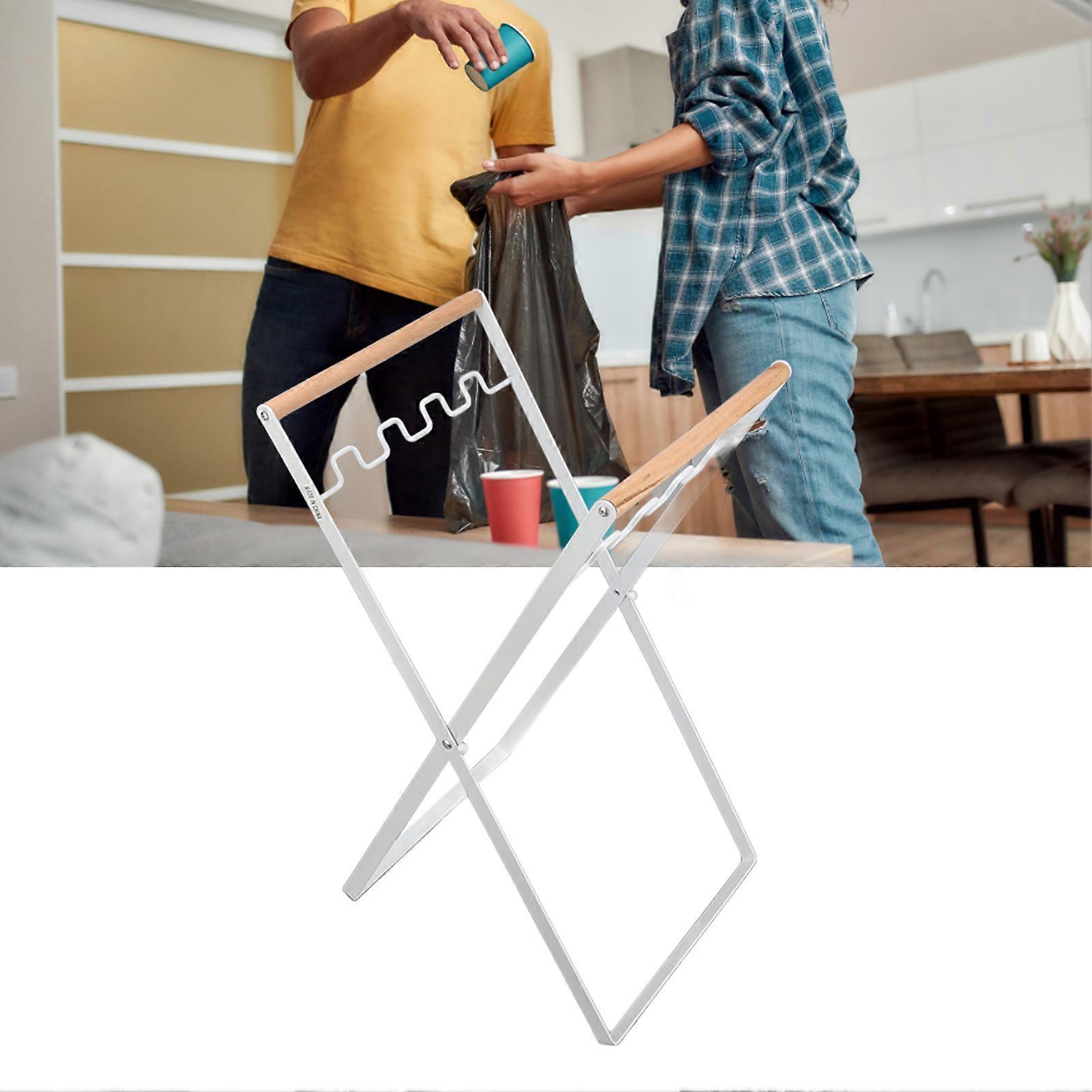 Trash Bag Holder Stand Rubber Wood Handle Iron Stand Flat Appearance Foldable Portable Garbage Bag Stand for Indoor Outdoor Use White