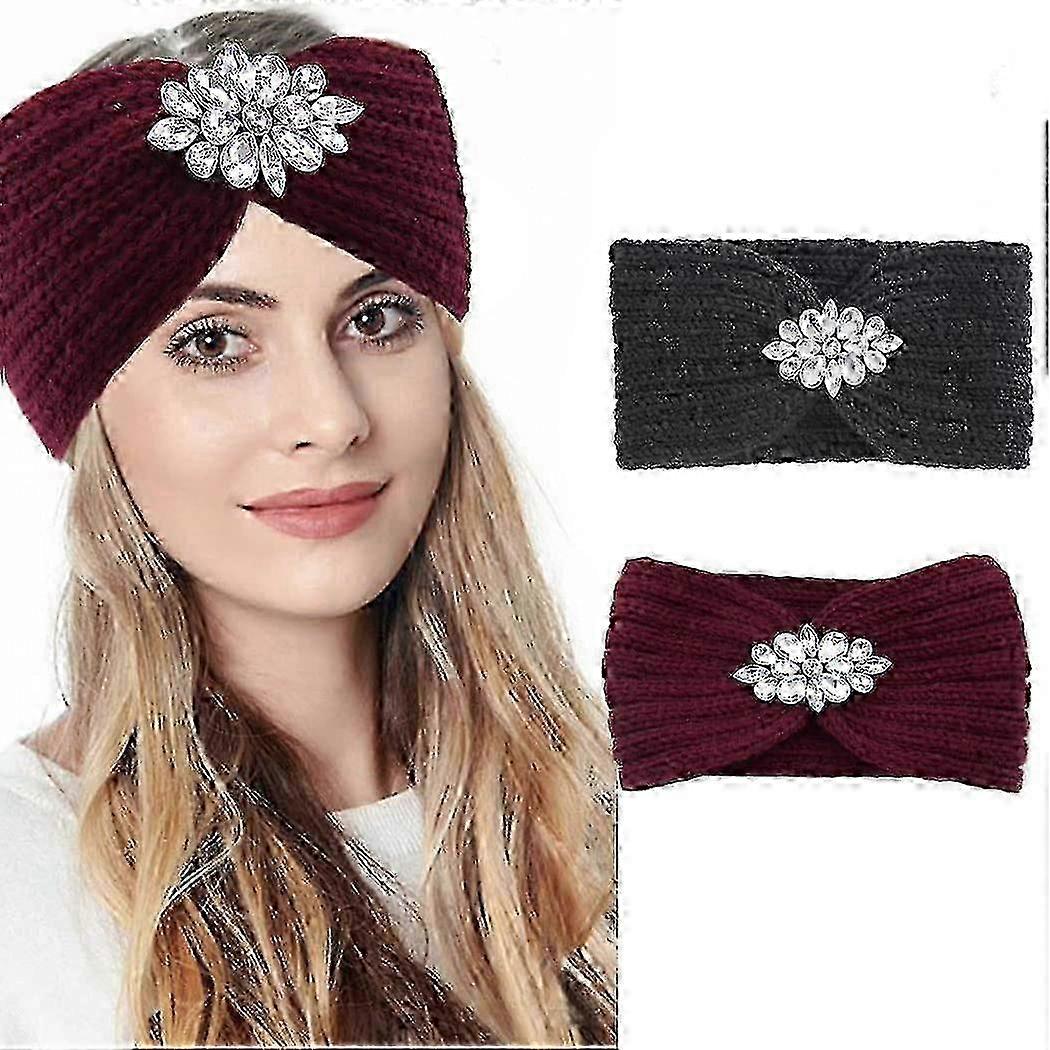 Gorin Crystal Winter Headband Knit Fuzzy Lined Ear Warmer Headband Stretch Crochet Turban Head Wraps Rhinestones Thick Hair Bands for Women A-G