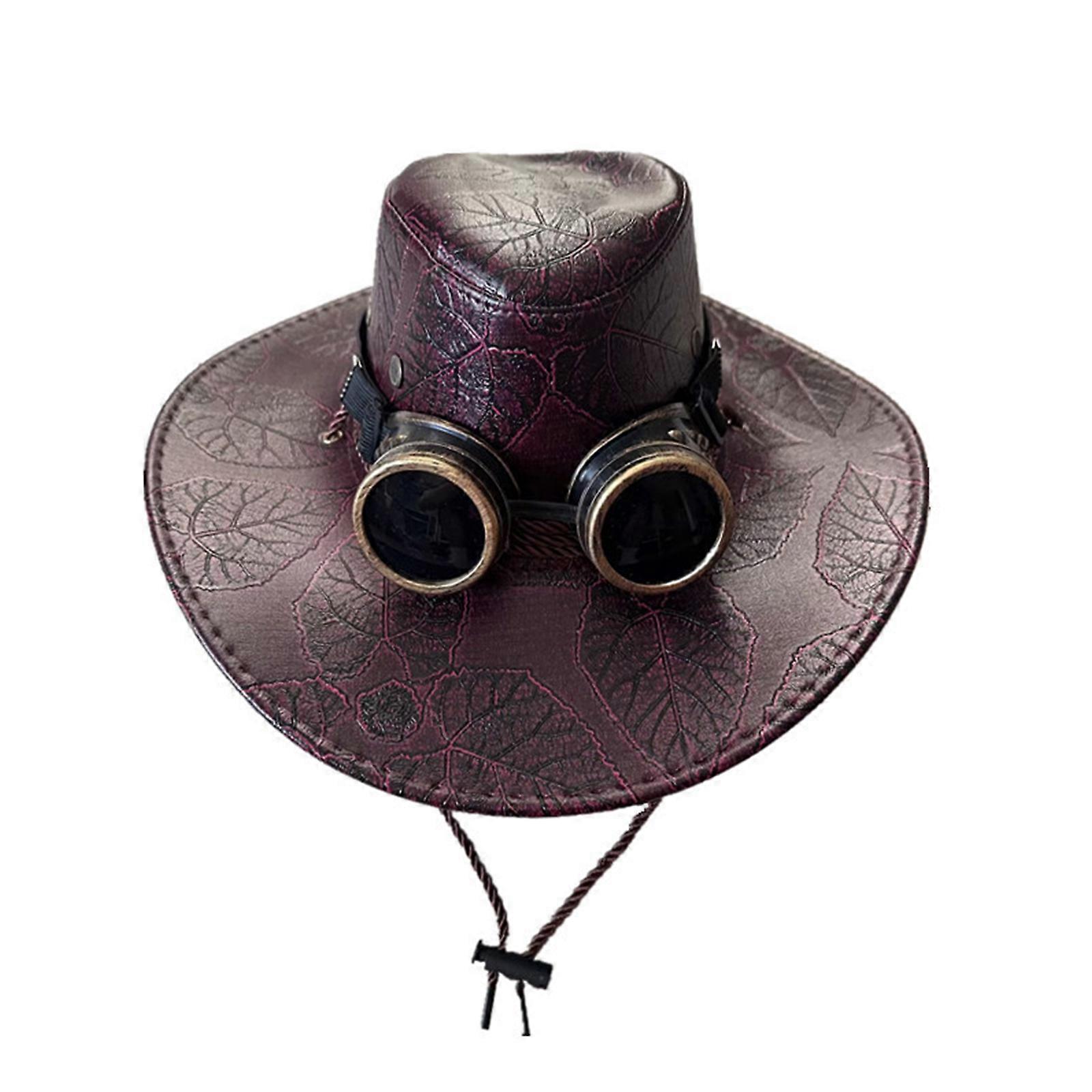Steampunk Cowboy PU Hat for Adult with Goggles Vintage Victorian Steampunk Costume Cap Women Men Halloween Party Props deep burgundy
