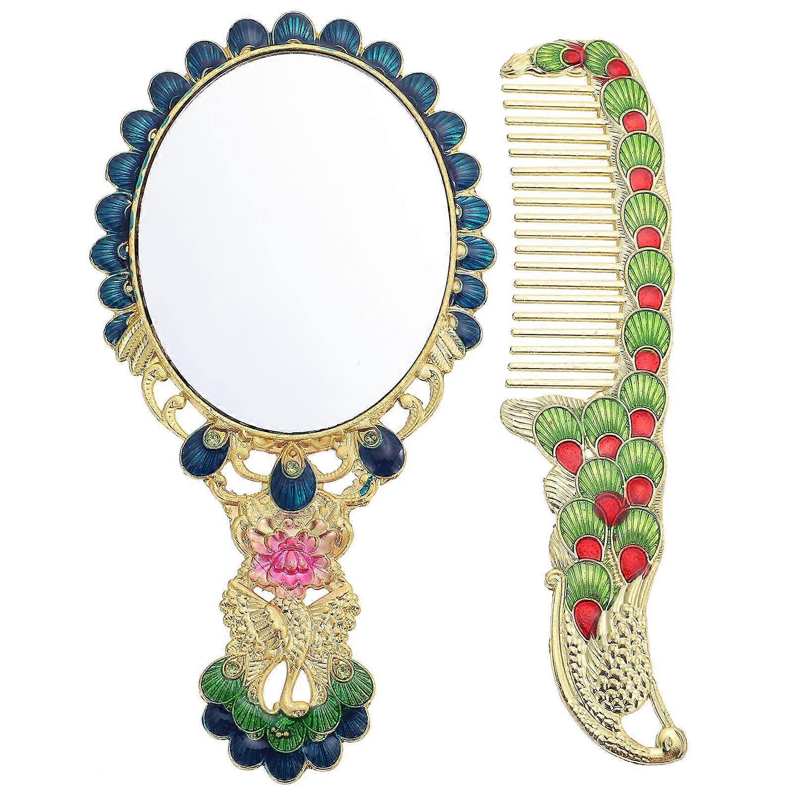 Golden Vintage Peacock Pattern Makeup Mirror and Comb Set for Home Use 1 Piece Zine-alloy