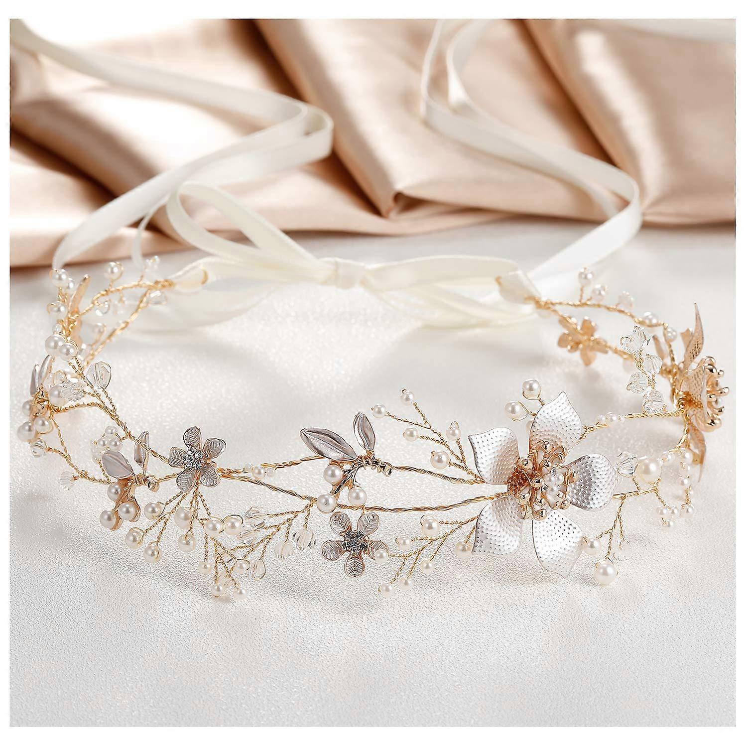 Gold Wedding Headband, Pearl Flower Bridal Headpieces for Wedding, Crystal Hair Accessories for Women Girls Hair Vine
