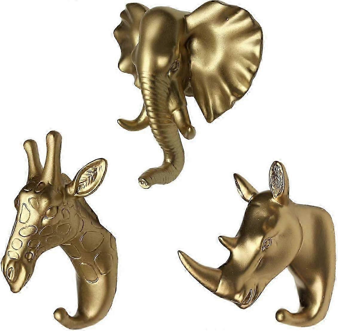 Gold Rhinoceros Giraffe Head Wall Hooks - Set of 3 Hooks