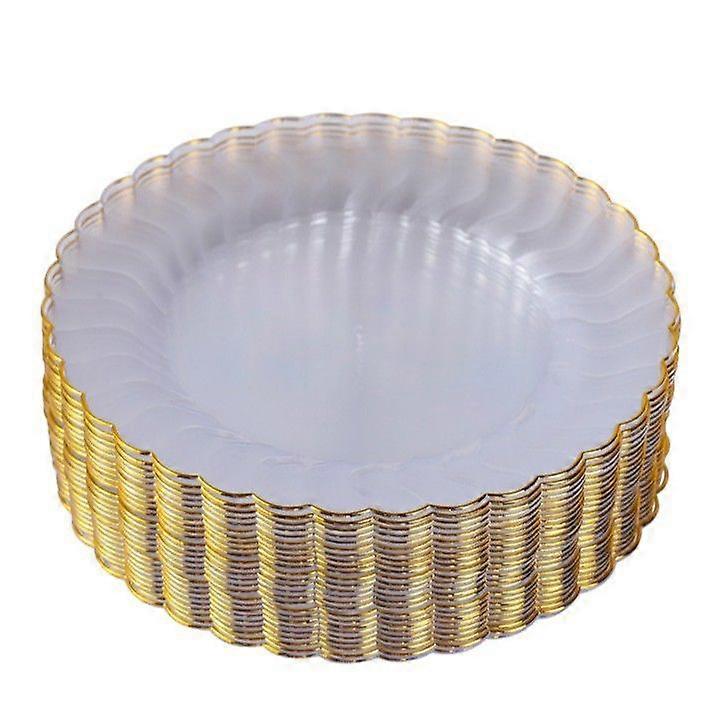 50pcs Plastic Plates With Gold Trim - 6.3-Inch Round Serving Trays For Weddings Catering - Birthday Snacks Appetizer Platters For Desserts Cakes