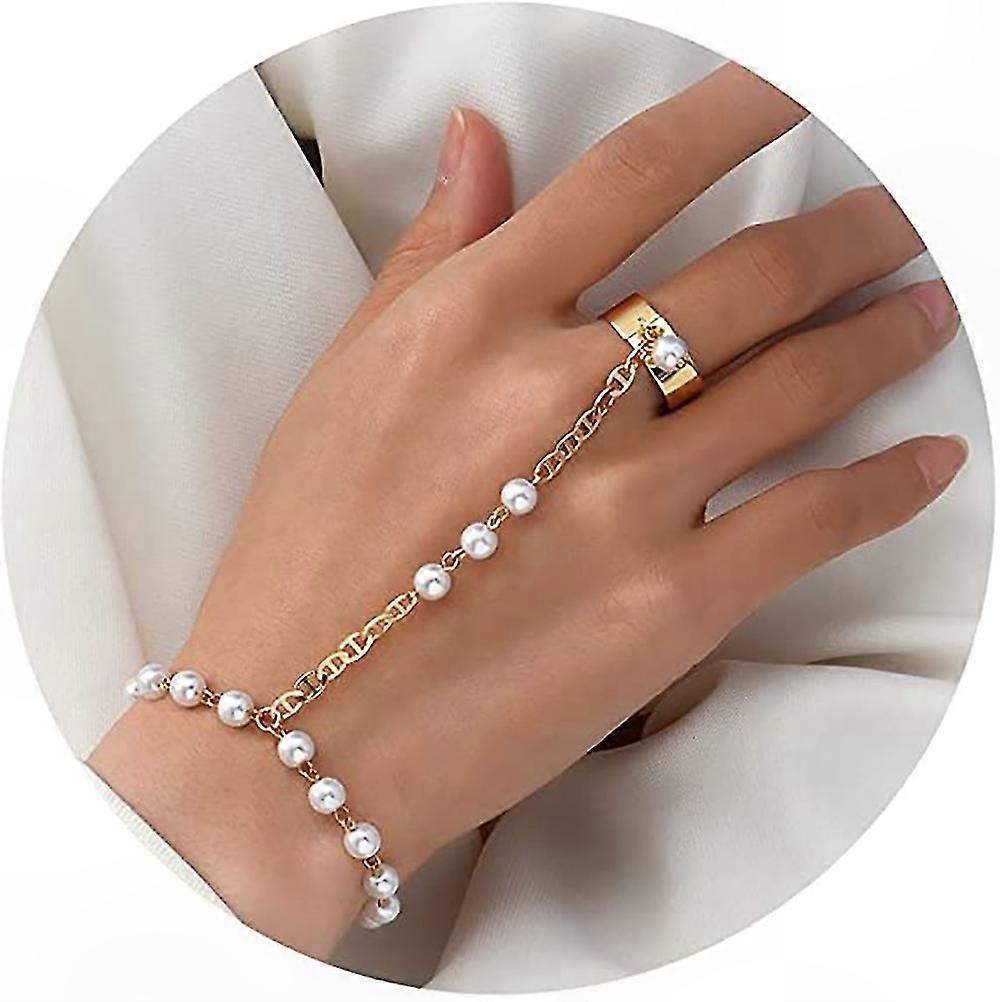 Gold Heart Beaded Infinity Bracelet for Girls Pearl Hand Chain Jewelry with Finger Ring Design
