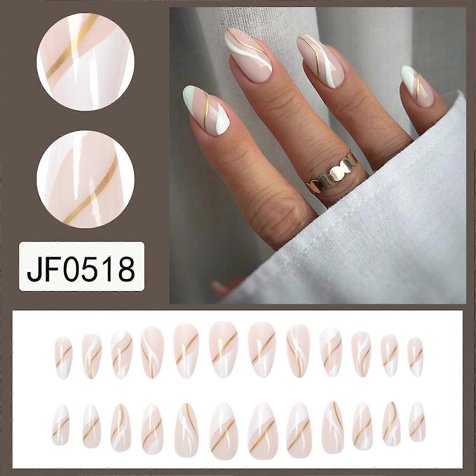 Gold White Line Almond Fake Nails Unique Trendy Pattern Nail Decors Glue Models