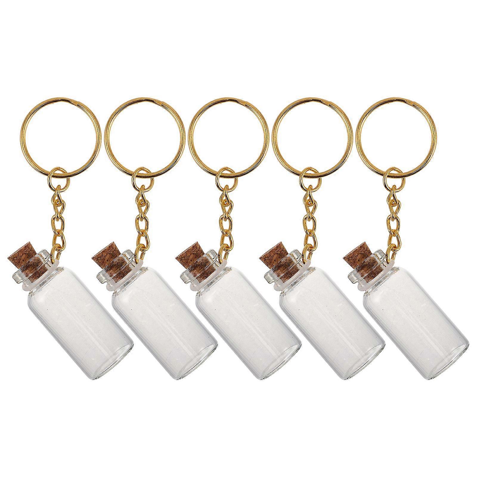 Description These mini glass bottles with cork stoppers are for a variety of uses. Their clear design allows you to see the contents inside, making them ideal for DIY crafts, wedding favors, and home decor. The included metal keychain adds a touch of practicality. Features -Color:Golden -Material:Glass, wood, metal -Size:4.50X1.70X1.70cm/1.77X0.67X0.67in -Multipurpose use: ideal for diy crafts, wedding favors, parties, and home decor, these mini glass bottles offer versatile functionality for various occasions -Elegant design: featuring mini glass bottles with cork stoppers and metal keychains, these bottles are charming and adorable, for adding a touch of elegance -Strong sealing: each bottle comes with a cork stopper that ensures a tight seal, and a metal hook for easy hanging, making them practical and decorative - capacity: these bottles are for storing small items or liquids, providing ample space for your needs -Creative present idea: these unique bottles make thoughtful present, allowing you to show your creativity and care to friends and loved onesPackage list: 5 x Mini Glass Bottles