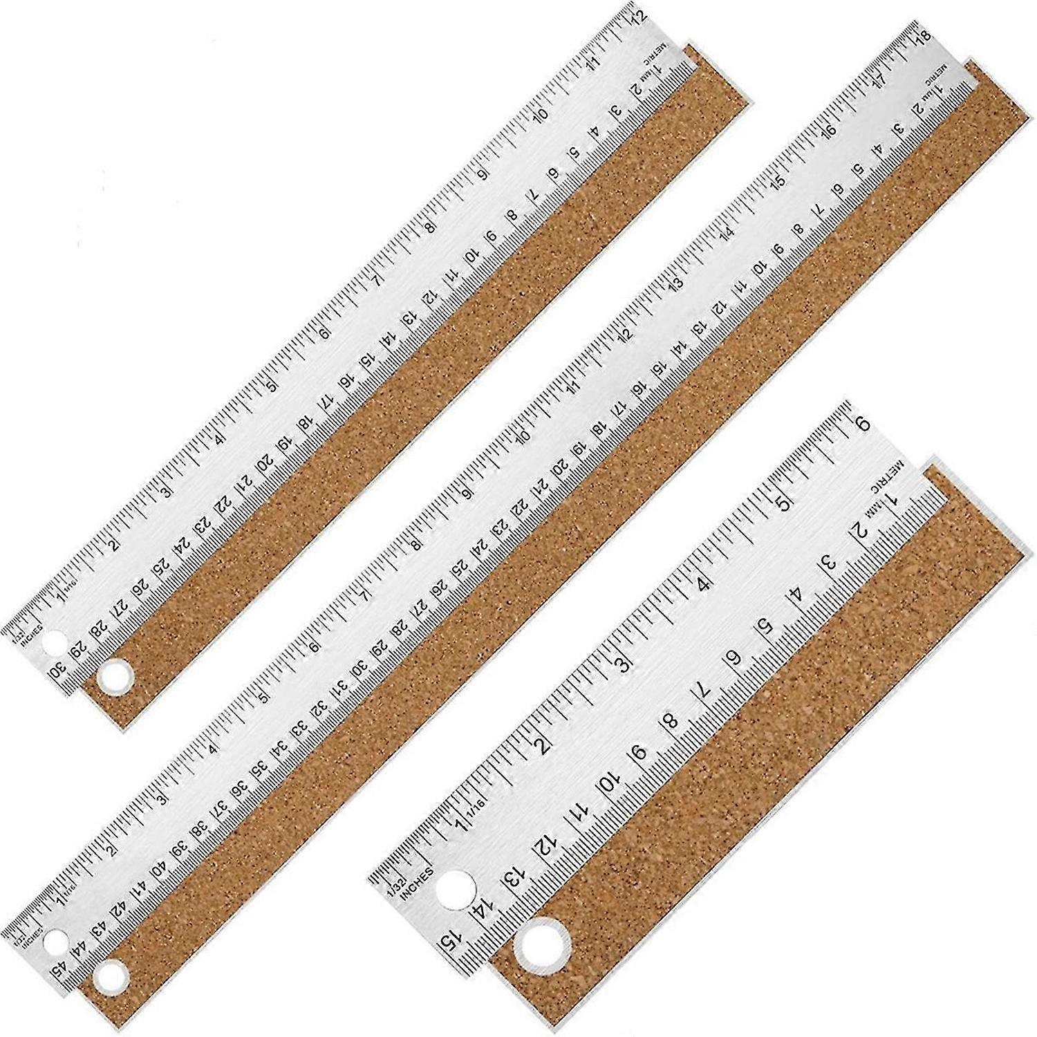 Comprehensive Ruler Set: Each purchase delivers three superior stainless steel rulers encased in a cork backing, sized at 6 inches (15cm), 12 inches (30cm), and 18 inches (45cm). Perfect for various dimensions, these durable, long-lasting rulers fit every measuring necessity, ensuring value and multipurpose utility. Enhanced Stability with Cork Backing: Designed with a cork backing, these metal rulers offer a slip-resistant advantage, ensuring your ruler stays firm during use. This innovative feature aids in avoiding ink smears beneath the ruler's edge, thereby providing precise measurements while shielding your workspace. Precision Etched Markings: Our rulers emphasize distinct, easy-to-read imperial and metric measurements. These etched markings are infused with paint, increasing their durability and readability. Experience flawless measurement capturing with consistent accuracy to meet all professional and household demands. Durable Build Quality: Crafted with premium steel paired with resilient cork material, these rulers withstand bending or warping, maintaining their precision over time. With their robust construction, they are essential long-lasting tools for anyone requiring dependable measurement instruments. Versatile Tool for Multiple Domains: Tailored for diverse applications, this set thrives across environments-be it home, school, or professional workshops. perfect for drafting, woodworking, and establishing precise guidelines, these rulers serve well for architects, engineers, fashion designers, DIY enthusiasts, and more.<br><br>Colour:As Shown Material:Metal+wood<br><br>Package Contents: 3 * Stainless steel ruler<br><br>Only the above package content, other products are not included. Note: Light reflection and different displays may cause the color of the item in the picture a little different from the real thing. The measurement allowed error is +/- 1-3cm.