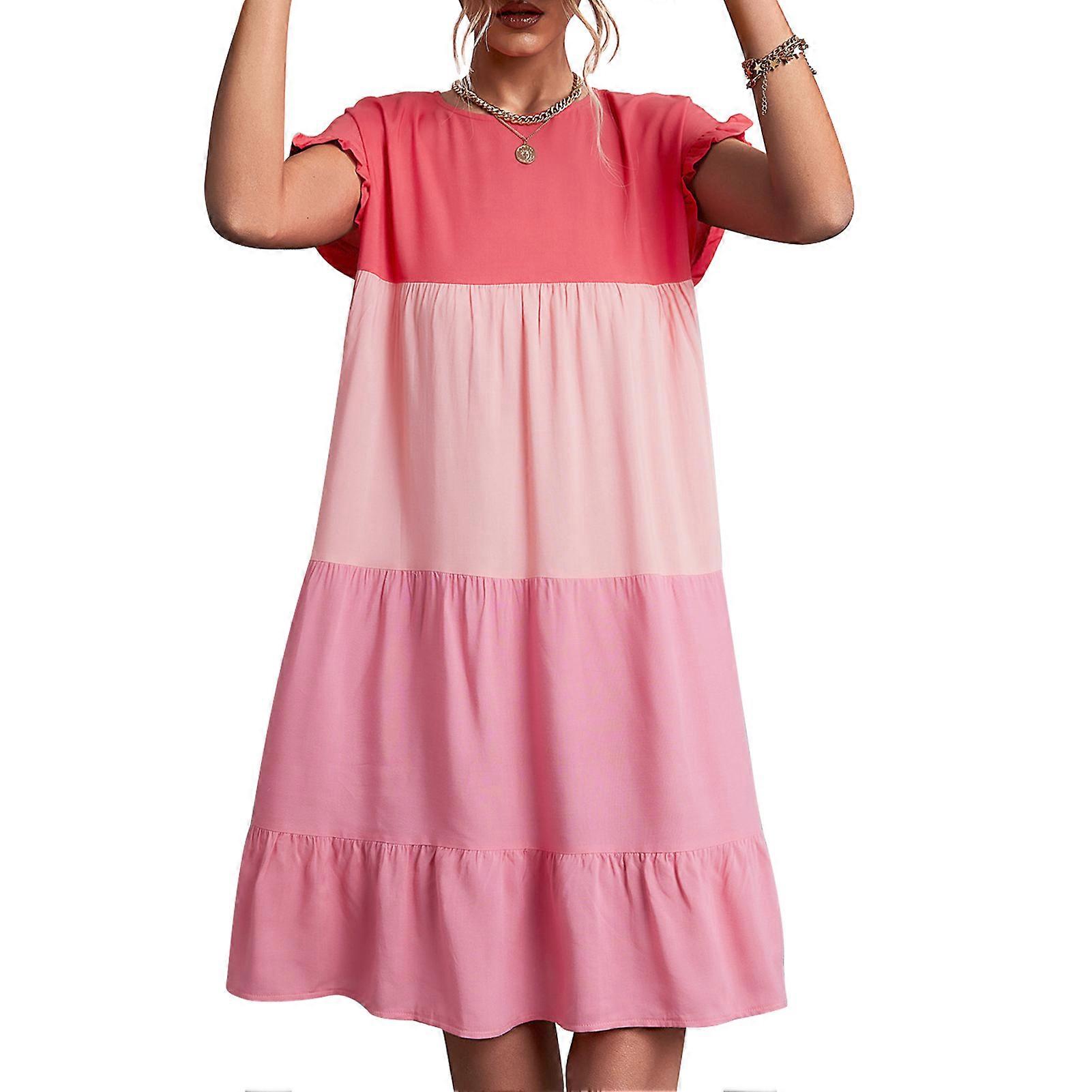 Contrast Color Splicing Dress Classic One Piece Dress with Ruffled Cuffs Machine Washable for Summer Pink M