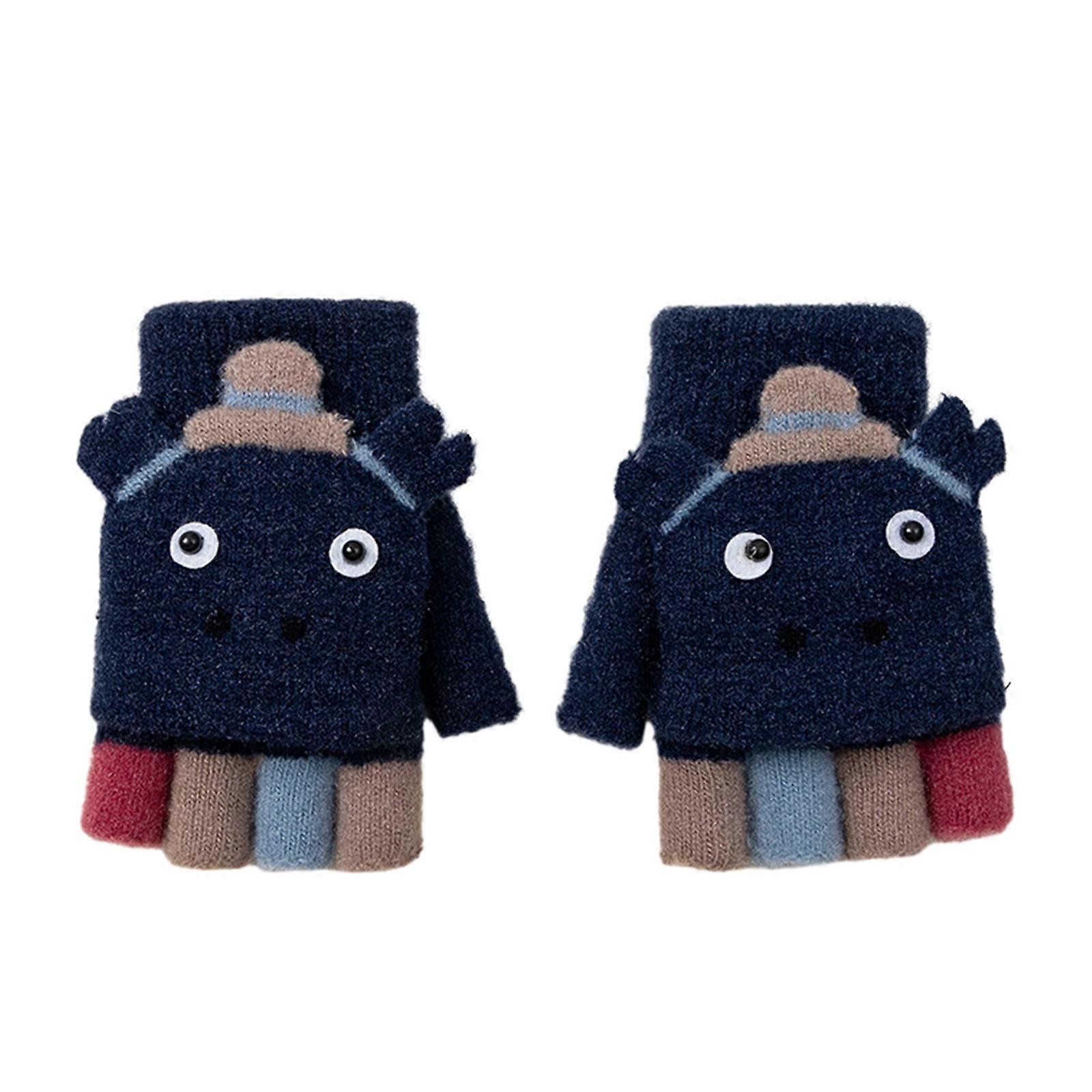 Convertible Gloves Winter Half Finger Mittens Stretchy Knit Half Finger Gloves with Flip Cover for Kids Unisex Lovely Navy Blue