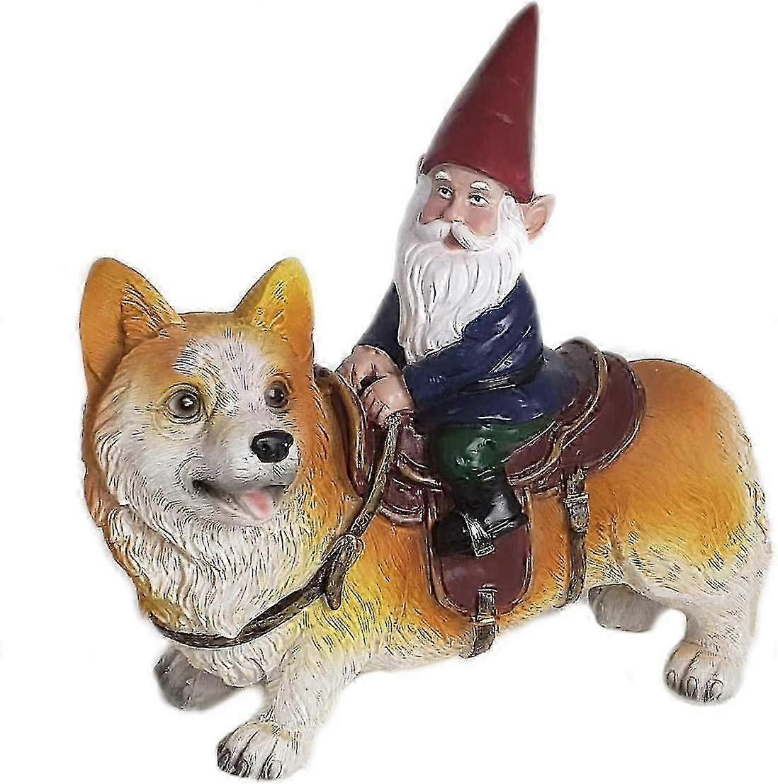 Funny Gnome Riding a Corgi Statue - Indoor/Outdoor Garden Sculpture for Patio, Yard or Lawn