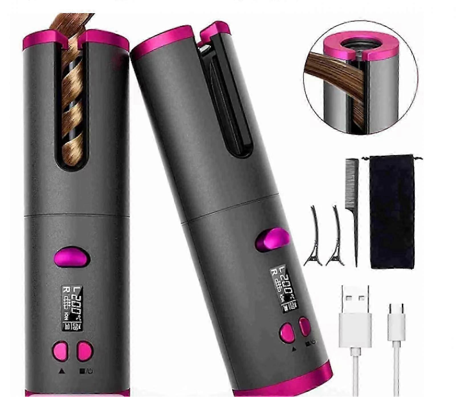 Cordless Auto Hair Curler Automatic Curling Iron with LCD Display Adjustable Temperature & Timer Portable Rechargeable Rotating Ceramic Barrel Curling