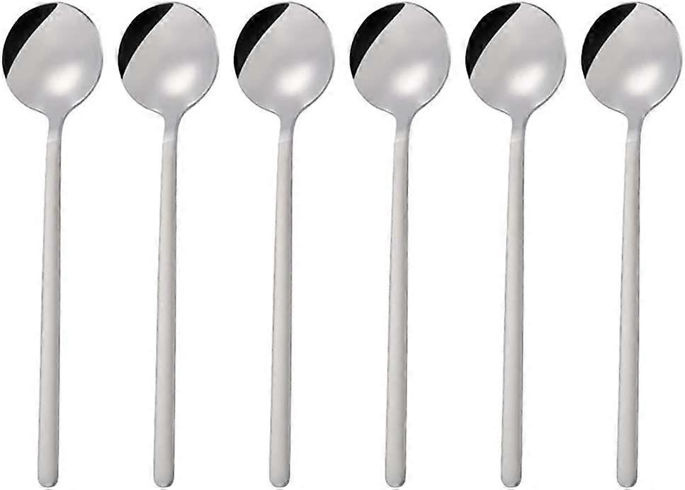 XIANQI Suitable for home, restaurant, hotel, cafe, bistro and bar, etc. Suitable for tea, coffee, cappuccino, espresso, dessert, milk, stirred sugar, cream, etc. The overall surface is finely polished, shiny as a mirror, easy to clean, highlighting the high-grade quality. The handle is smooth and finely polished, non-slip, comfortable grip and easy to operate. Round stainless steel spoon set, very durable and practical Color: Silver Size: 13*2.9cm Product list: 6 * spoon