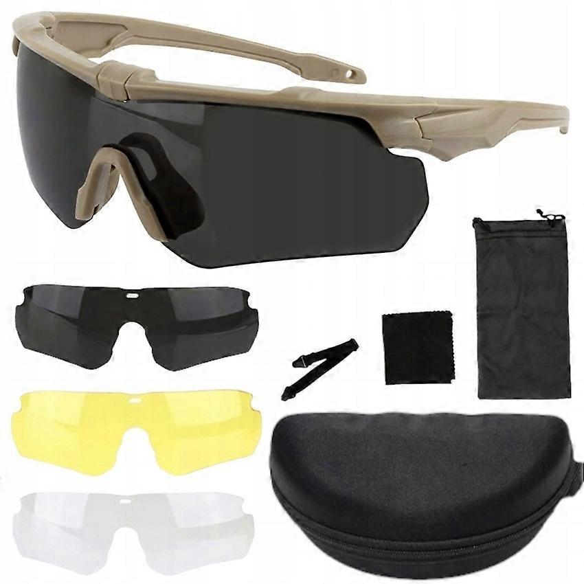 MILITARY GLASSES TACTICAL GOGGLES SPORTS POLARIZED ASG WITH A SET OF GLASSES A sunny day, a cloudy afternoon, a rainy morning – and Ty still see everything clearly! Choose polarized glasses and start your workout. Handy accessory gives you the freedom to adjust do current weather conditions. The cycling glasses are made of lightweight but strong plastic. Covered with non-slip material, the temples have additional ventilation holes to prevent sweating of the skin. They are extremely light. ATTENTION! The product does not constitute ballistic protection of the eyes and using it for this purpose is incompatible with its intended purpose! The manufacturer or distributor is not responsible for the misuse of the goggles. THE MOST IMPORTANT ADVANTAGES: Tactical - full military specification excellent do shooting and extreme sports 3 interchangeable viewfinders in polycarbonate Certificate EN1836:2005 A1:2007 UV filter 400 100%, UVA, UVB and UVC Anti-Sratch protects against scratches Anti-Fog protects against evaporation Best optical class (optical class 1) Wide-angle glass, full visibility Durable TPE plastic housing Comfortable nose pads with a large surface area Long, flexible temples Rubber-coated temples Lanyard or stopwatch holes Microfiber Protective Cover Weight 30 g They are not ballistic protection! FOR ALL CONDITIONS Sports glasses have been equipped with as many as 3 different, interchangeable glasses. Each of them has been developed to work under specific weather conditions. Basic – black will provide even better contrast, and above all effective protection against UV-A and UV-B rays. Replaceable glasses come in colors: Clear S0 (80-100%) - conditions of twilight and dusk Yellow S2 (60-80%) - cloudiness, fog, improves contrast Smoke S3 (8-18%) - sun, driving UV POLARIZED EYE PROTECTION The glasses are ANSI Z87.1 certified to meet MIL-PRF 32432 high-speed collision standards with 99% polarized UV protection. It provides UV protection for the eyes from both UVA and UVB rays. It brings joy to a pure vision. Anti-reflective coating improves visibility. MANY POSSIBILITIES Running, riding a two-wheeler, climbing in the mountains – and Ty, where will you take your sports glasses? They have a spherical shape, which exactly covers the eyes so that you are not blinded by sunlight or a flash of light, the wind does not interfere with driving or insects. The glasses weigh only 30 grams and are made of lightweight but strong plastic. Covered with non-slip material the temples have additional ventilation holes to prevent sweating of the skin. HANDY CASE The robust, lightweight case in which the glasses were hidden allows to safely store them and take them on any journey. The elegant black box with padded bottom holds a full set of interchangeable glasses and guarantees protection of the contents against possible mechanical damage. Etui is closed with a convenient lock. KHAKI GREEN BLACK
