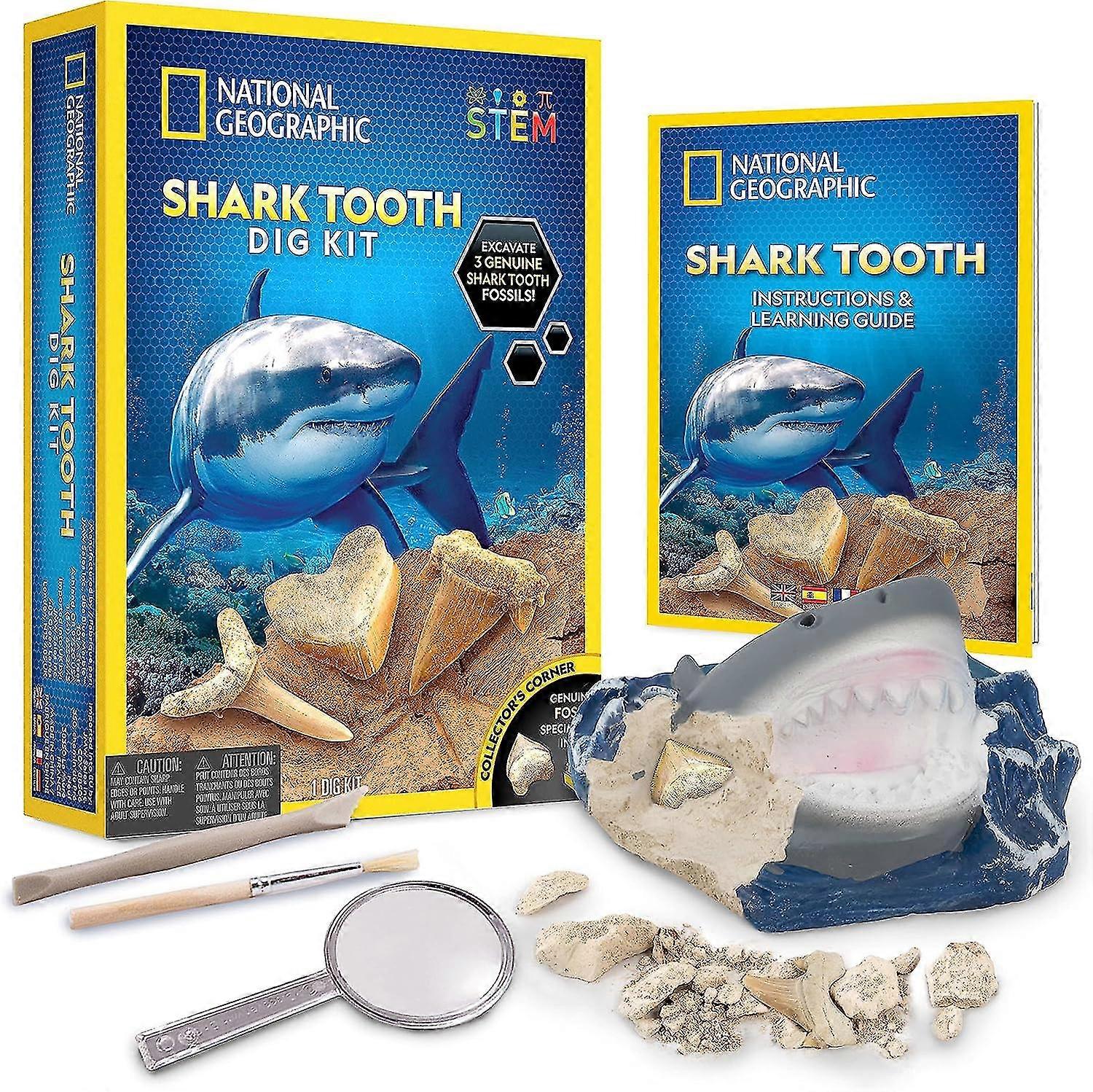 EXCAVATE 3 REAL FOSSILS \u2013 Dig and discover 3 real shark tooth fossils, each from a different shark species Start an impressive fossil collection. BECOME A SHARK SCIENTIST \u2013 Identify teeth from the Sand tiger, Otodus, and Crow sharks and learn awesome shark facts with the included learning guide. EDUCATIONAL HANDS-ON FUN \u2013 Kids will love digging up these fossilized teeth and learning all about sharks This kit makes a great homeschool lesson INSPIRING A GENERATION \u2013 Make learning fun This exciting digging adventure will inspire future archeologists and marine biologists. HIGH-QUALITY EDUCATIONAL TOYS - National Geographic is proud to make the highest quality hands-on science toys, and all are backed by exceptional service and a commitment to your satisfaction. Warning:Not suitable for children under 36 months