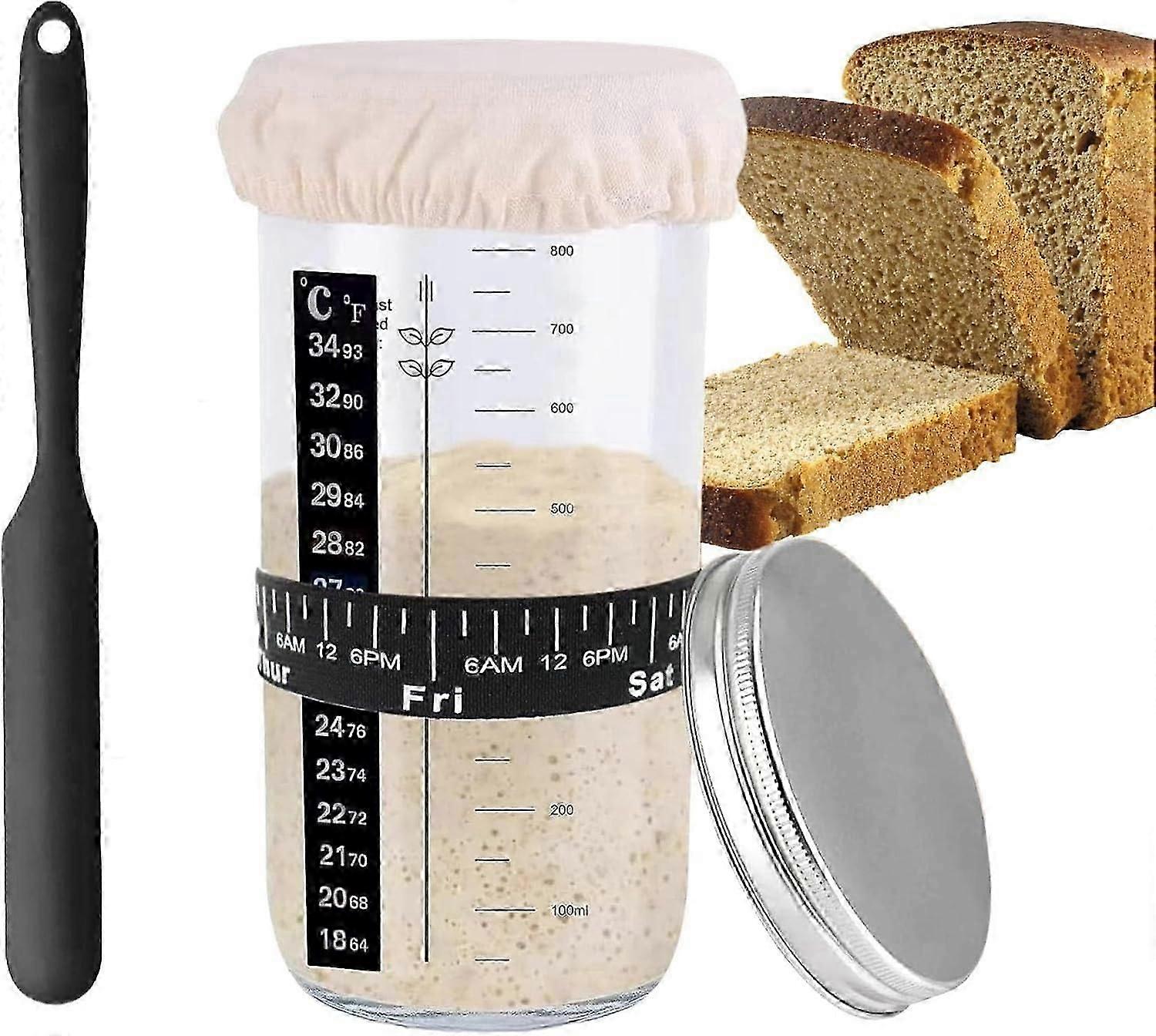 Sourdough Starter Jar Kit, 1000ml Jar with Aluminum Lid, Date Mark, Scraper, Cloth Cover, Feeding Band, and Thermometer Band