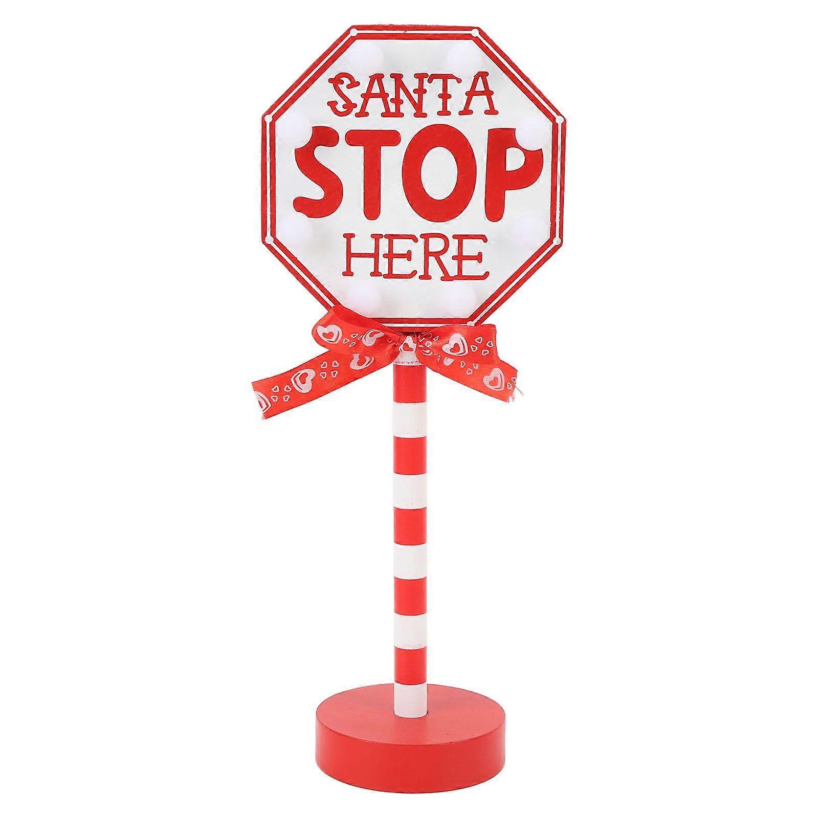 Santa Stop Here Pole Sign Wooden Xmas Desktop Decoration with LED Warm Light Gift