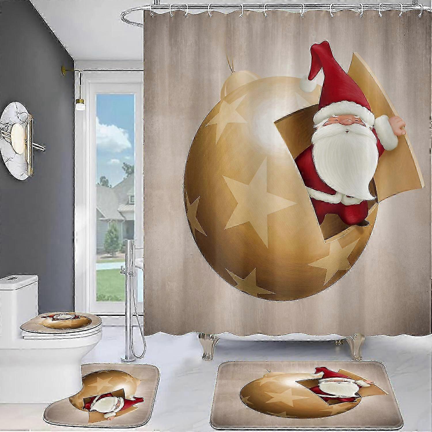 Santa Claus Full Polyester Shower Curtain Flannel Covered Felt Cloth Plastic Base Floor Mat Bathroom, 4pcs Set - Quan