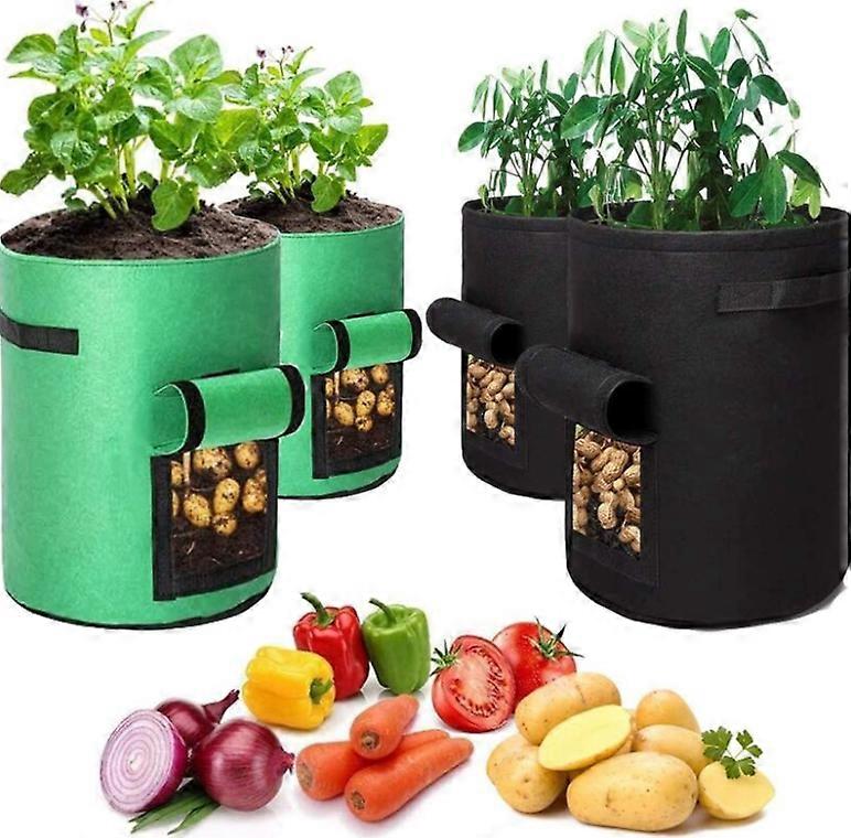 Package includes: 4 * planting bags Capacity: 2 * 10 gallons 2 * 7 gallons Color: 2 * green 2 * black Tips for planting potatoes: 1. Pour 2/5 of the soil or compost into the container, plant 2-3 seed potatoes or potatoes. 2. After the seedlings have grown, continue to pour the soil into the container 3/5 of Stalactit 2-3 seed potatoes 3. When the seed potatoes are higher than the opening of the container, pour the soil and fill the container 3. Water regularly and the setting time of the potatoes is about 2-3 months. Meanwhile, the picking opening can be opened to observe the growth of potatoes. Harvesting begins when the stems and leaves are yellow. Try to choose large potatoes and let the small ones continue to grow. After harvesting, separate the bags and recycle the compost as soil amendment in the garden. Clean the planting bag and save it for the next planting. Note: The planting temperature of potatoes is about 20 degrees. Potatoes like dry soil. They are watered every two weeks. The dry humidity in each area will vary depending on the actual environment. It is best to have adequate sunshine and ventilation during the planting season. If you find that the rise is slow, you can add fertilizer to the pot.