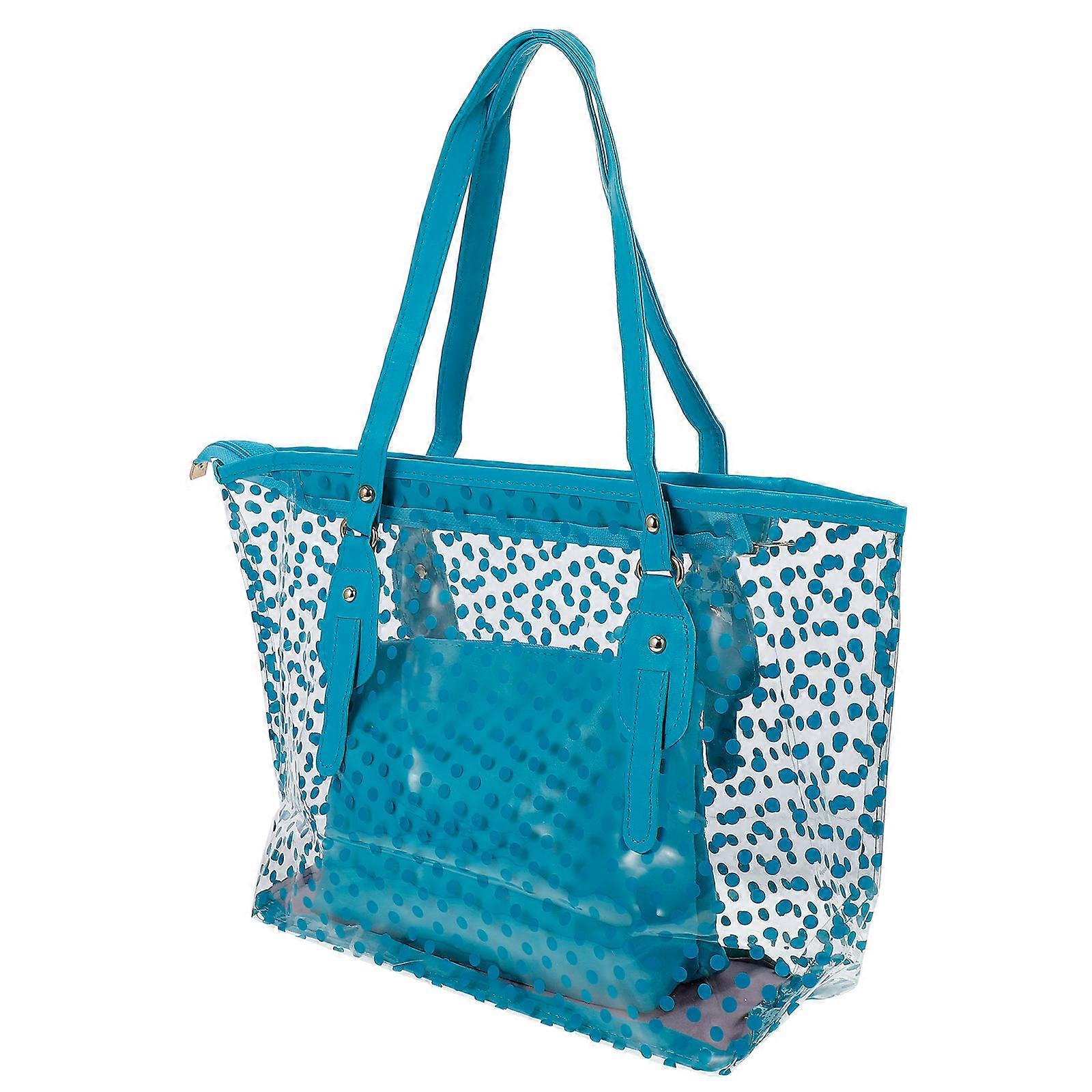 The inside-pocket bag design of this tote bag comes with high grade texture and structure, which will make it very practical for outside carrying to offer best protection and stability for your stuff. It can not only be apply for stuffing cosmetics, but also for holding daily products and other trinkets for travel uses. Features - Color: Blue. - Material: PU. - Size: Approx. 31x12x27cm - pu material with smoothly zippered design and super refine stitching for durable and use. - Lightweight with inside purse bag for portable carrying and organizing. Tear and scratch resistance. - Large capacity for loading numerous cosmetics, no more extra bags needed. Proper size make it a perfect costmetic bag for travel or business trip. Package list: 1 * Clear Zippered Tote Bag Dots Patterned Women Transparent Beach Handbag with Inside Purse Bag (Blue)